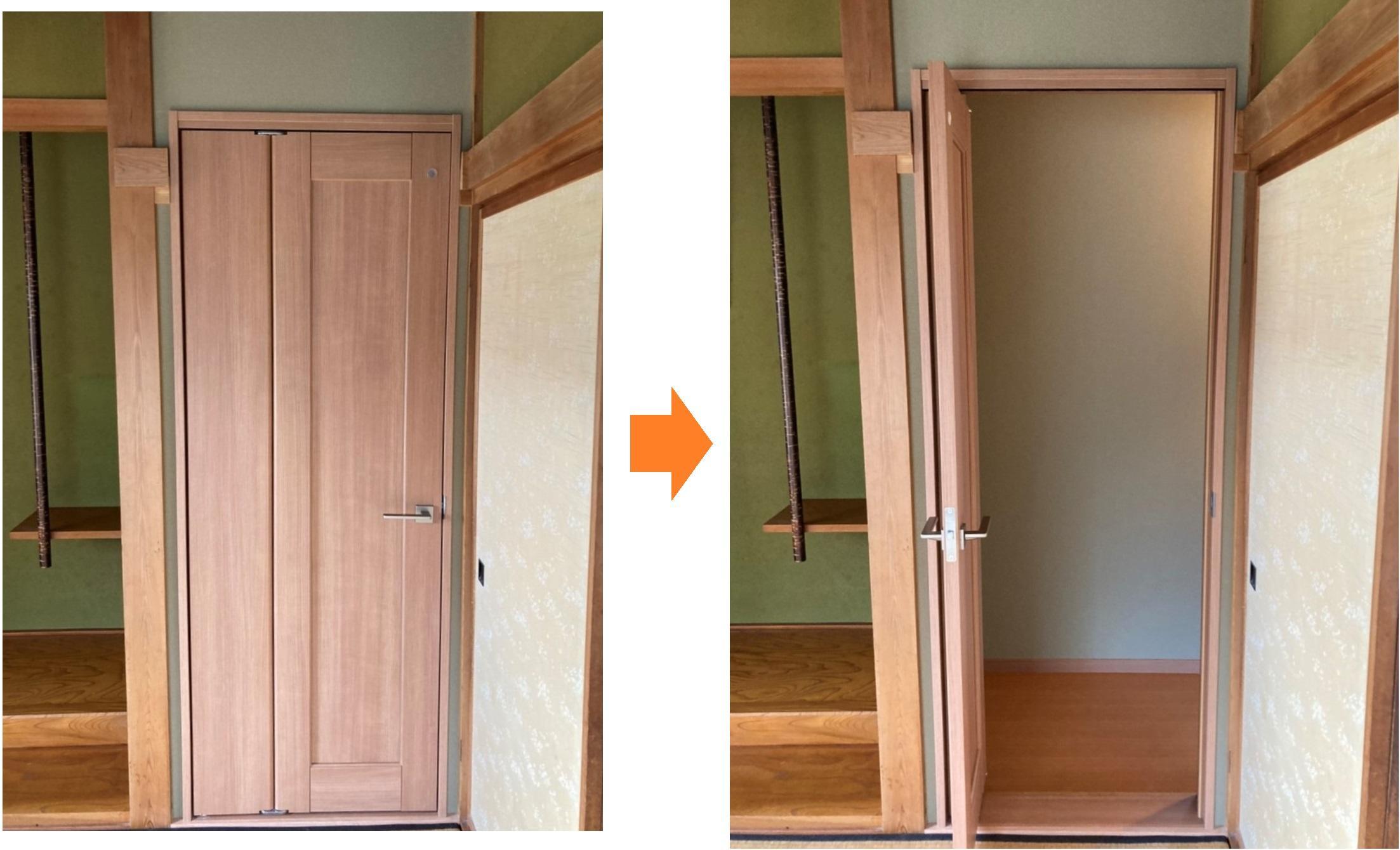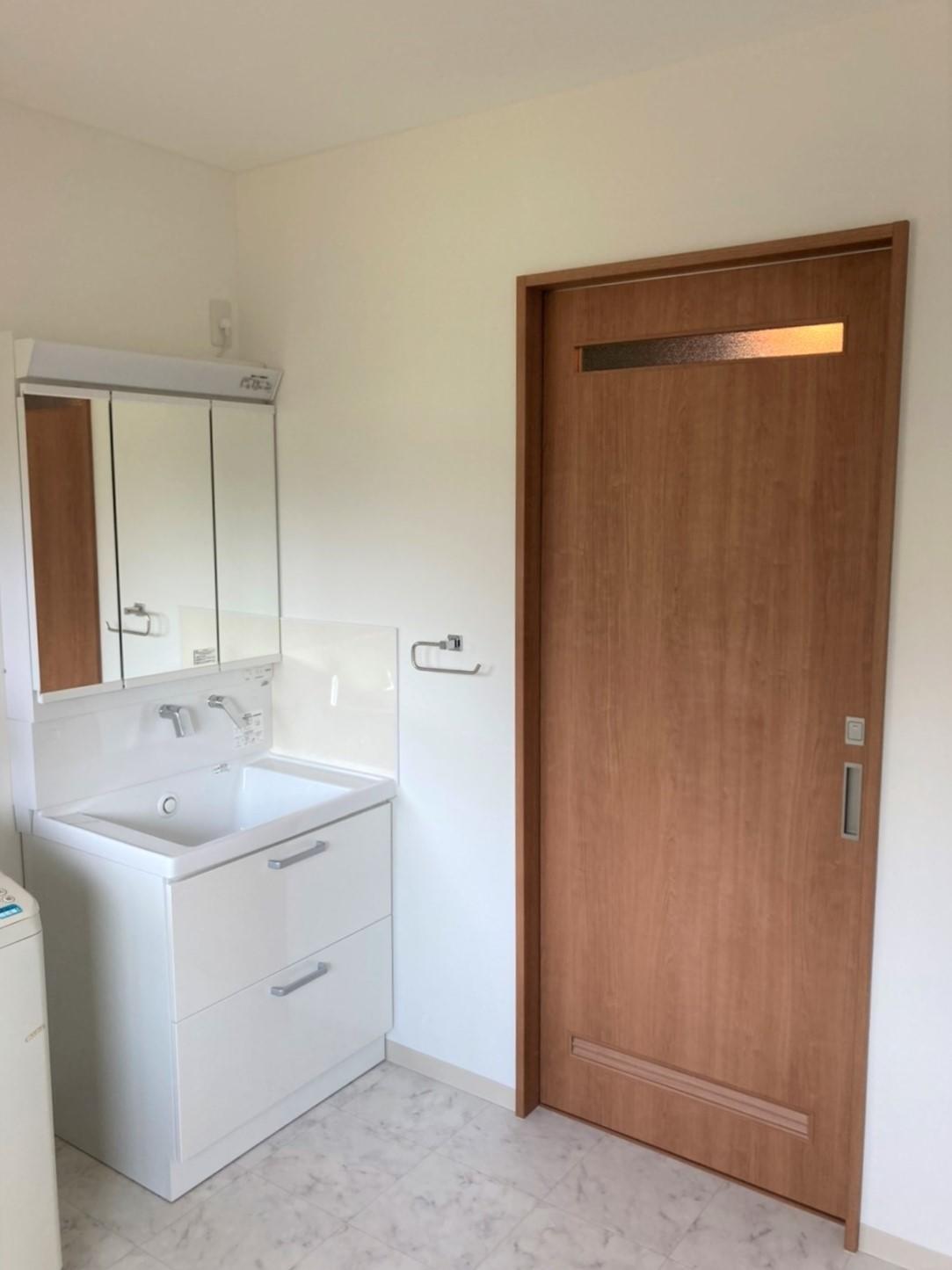 「お風呂を楽に入れるように」「家事の動線を効率よく」をキーワードにお客様との打合せを進めました。寝室から脱衣場横の廊下に直接行き来できるように、開口して折戸を設置しました。この開口により、その先にあるトイレまでの距離も縮まりました。洗濯・洗面脱衣場は大きく広げて“洗濯干しスペース”を作りました。天井・壁・床に断熱材をいれたので、脱衣場の防寒対策もばっちりです。 施工費(税込):350万~380万円 お引渡し:2021年8月