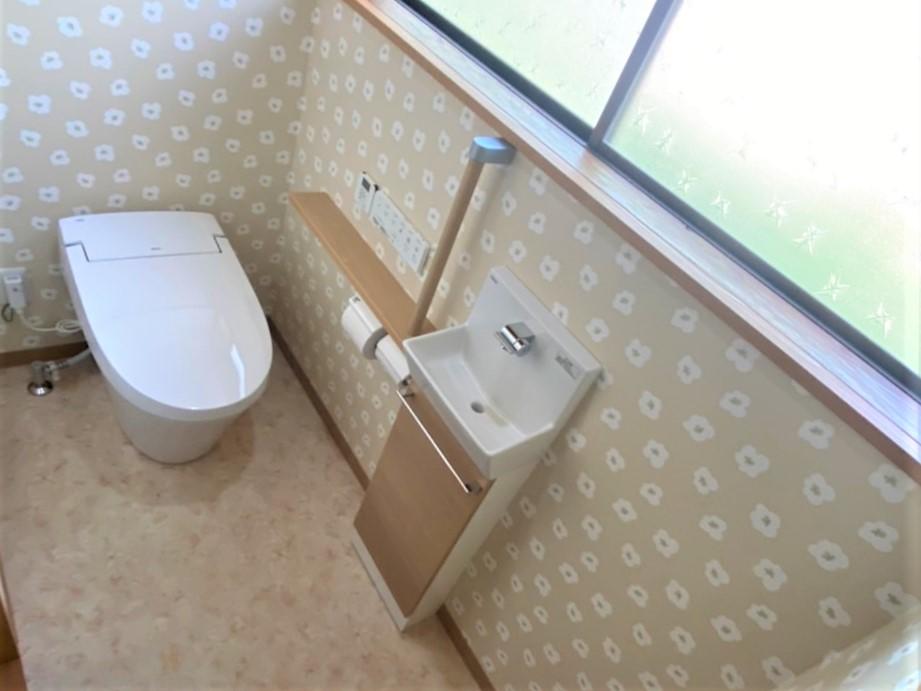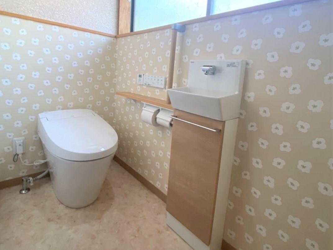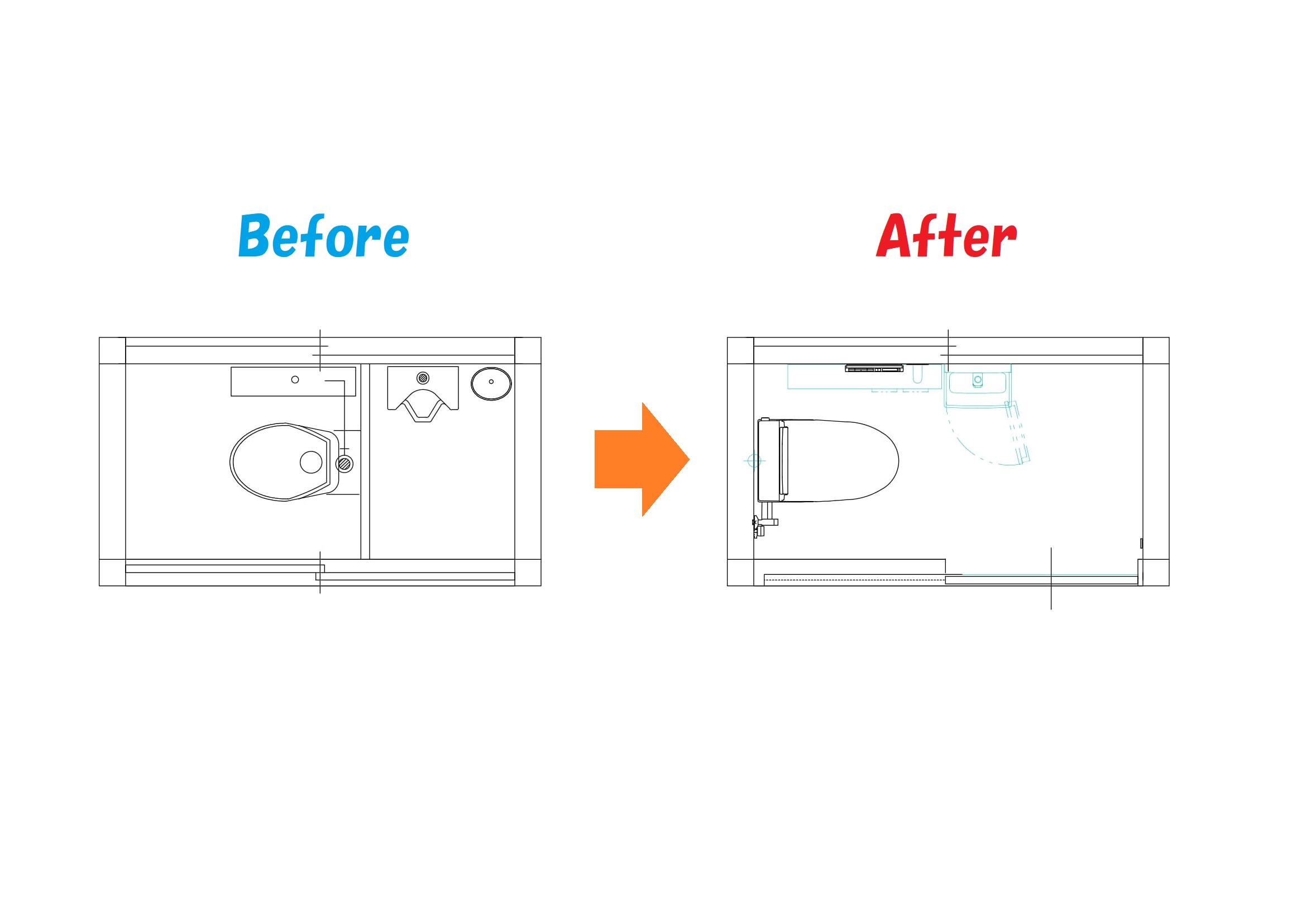 以前は洋式トイレと小便器が仕切られていました。当初は手洗器の横に小便器を付け直す予定でしたが、お施主様の家族会議の結果、洋式トイレ1台にして広く使えるようになりました。
