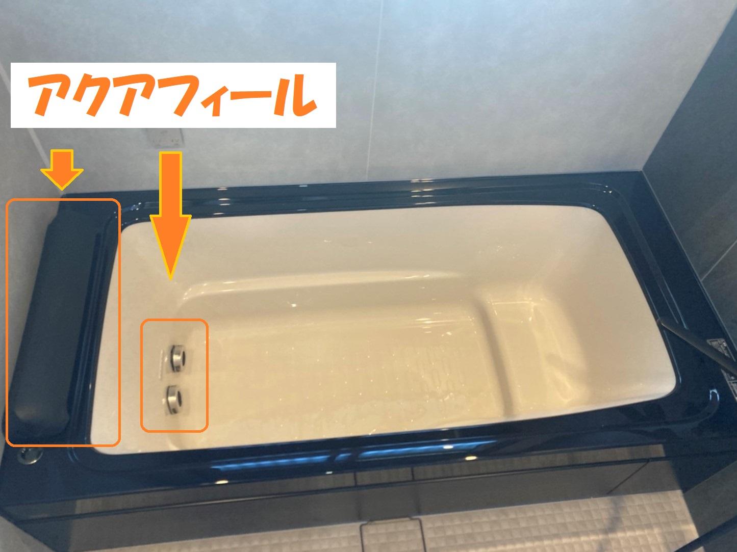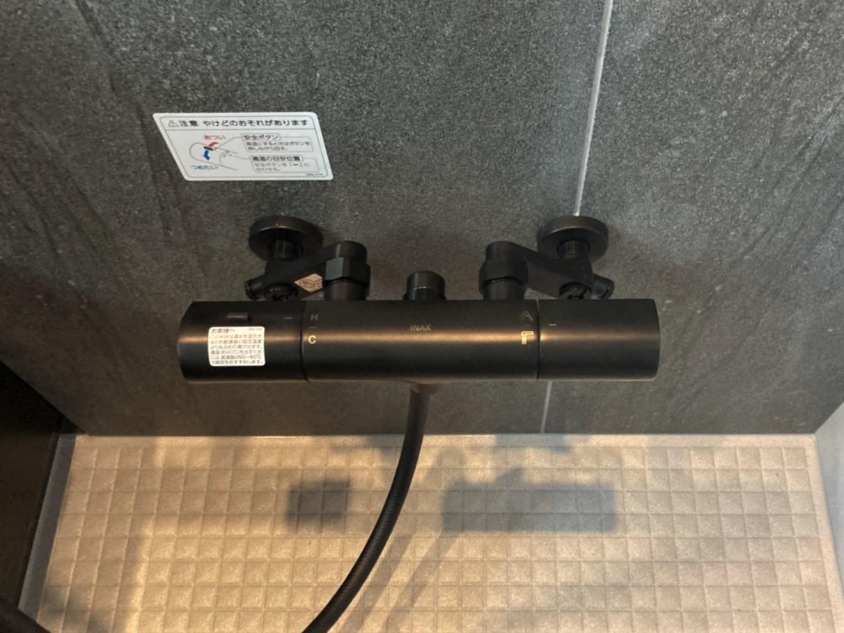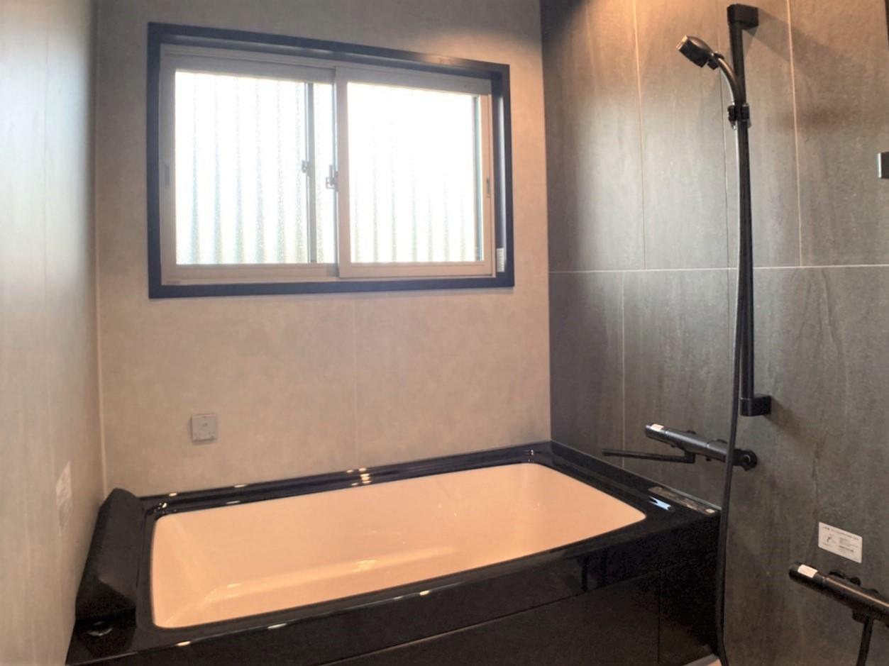 浴槽には「肩湯」などが搭載されていて、寒い季節でも体をほかほかに温めてくれます。設備は黒を基調として選ばれていて、浴槽エプロン、水栓、握りバー、天井、暖房換気扇、窓枠など、シックで素敵な浴室になりました。