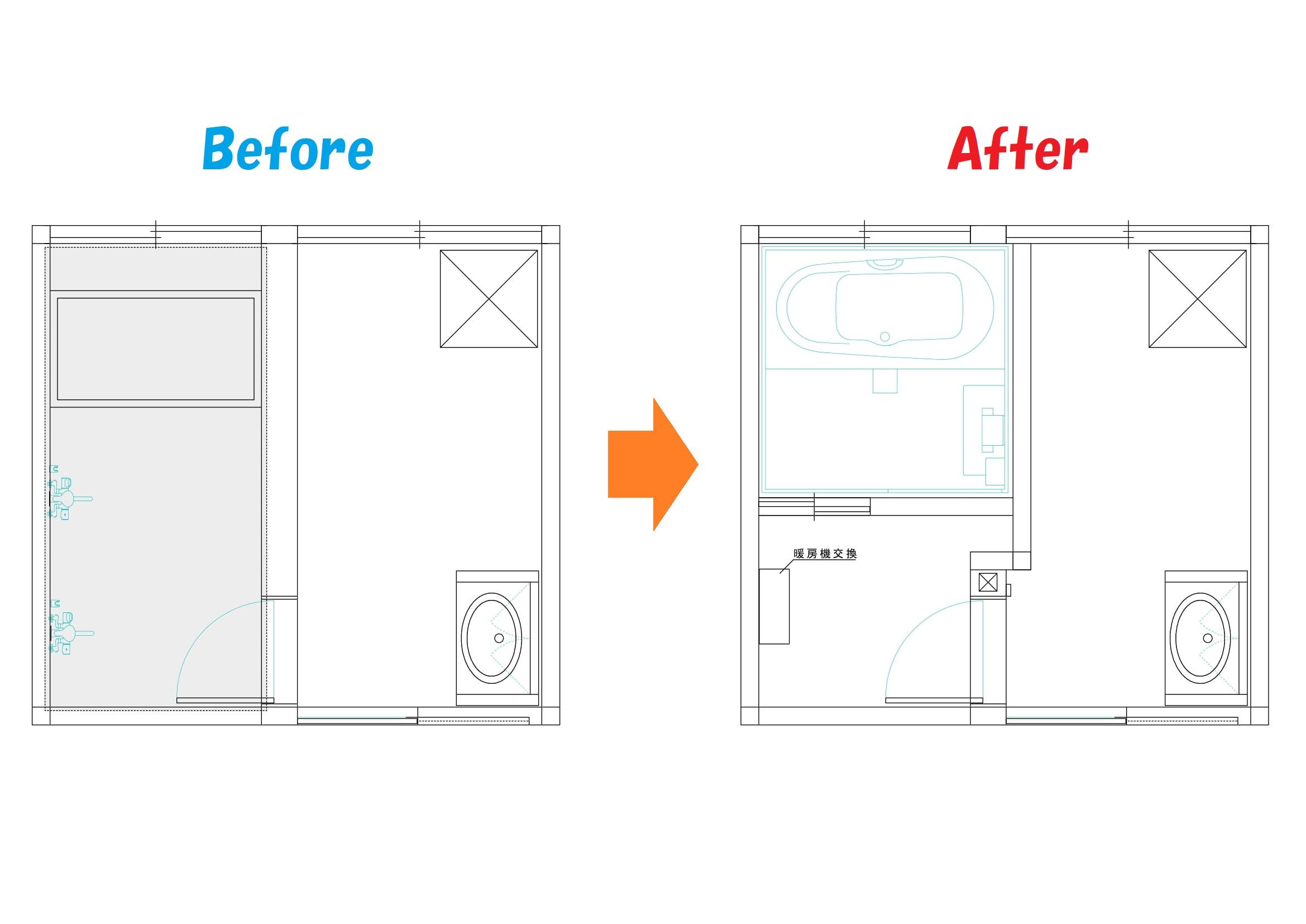 以前の浴室は1坪タイプのユニットバスが入らなかったため、浴室を広げました。大幅な解体が必要となりましたが、ゆったりとくつろげる浴室と脱衣所が出来上がりました。