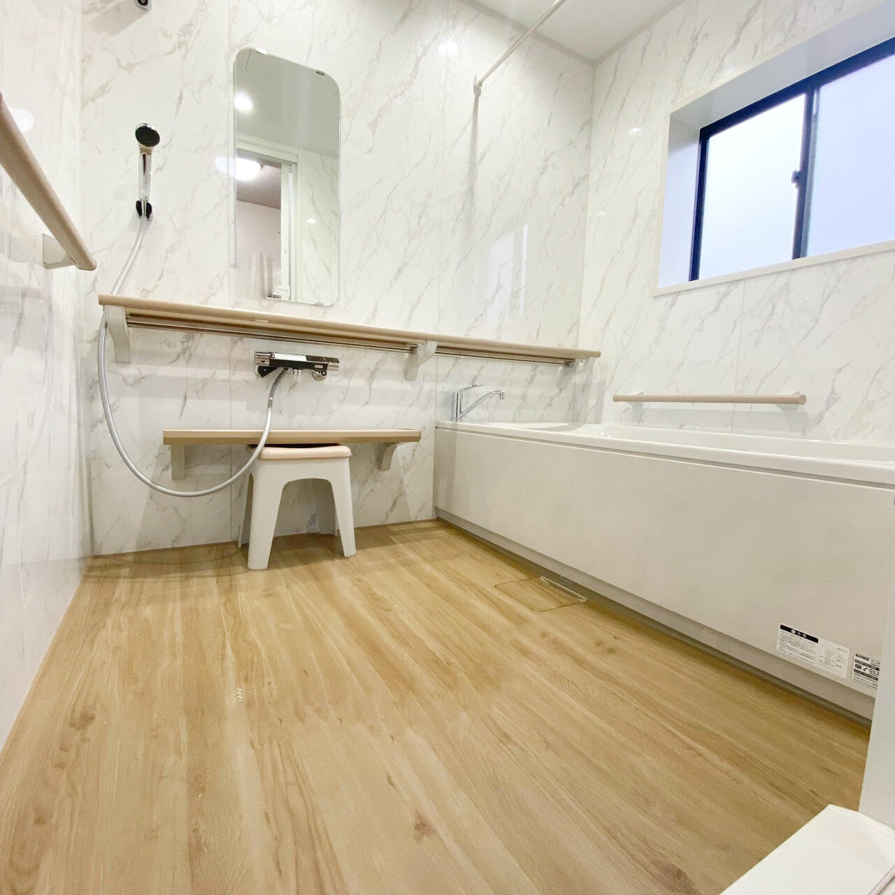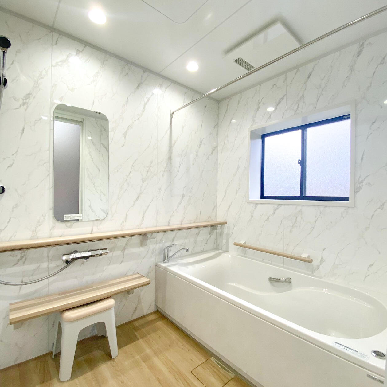 お風呂の水栓の止まりが悪く、修理しようかリフォームしようか迷っていらっしゃいました。 20年以上お使いの浴室だったため、今後他に悪くなるところが出てくる可能性もありました。 今回はお客様と相談しリフォームをすることに。 木目調の床が温かみのある空間を演出してくれます。
