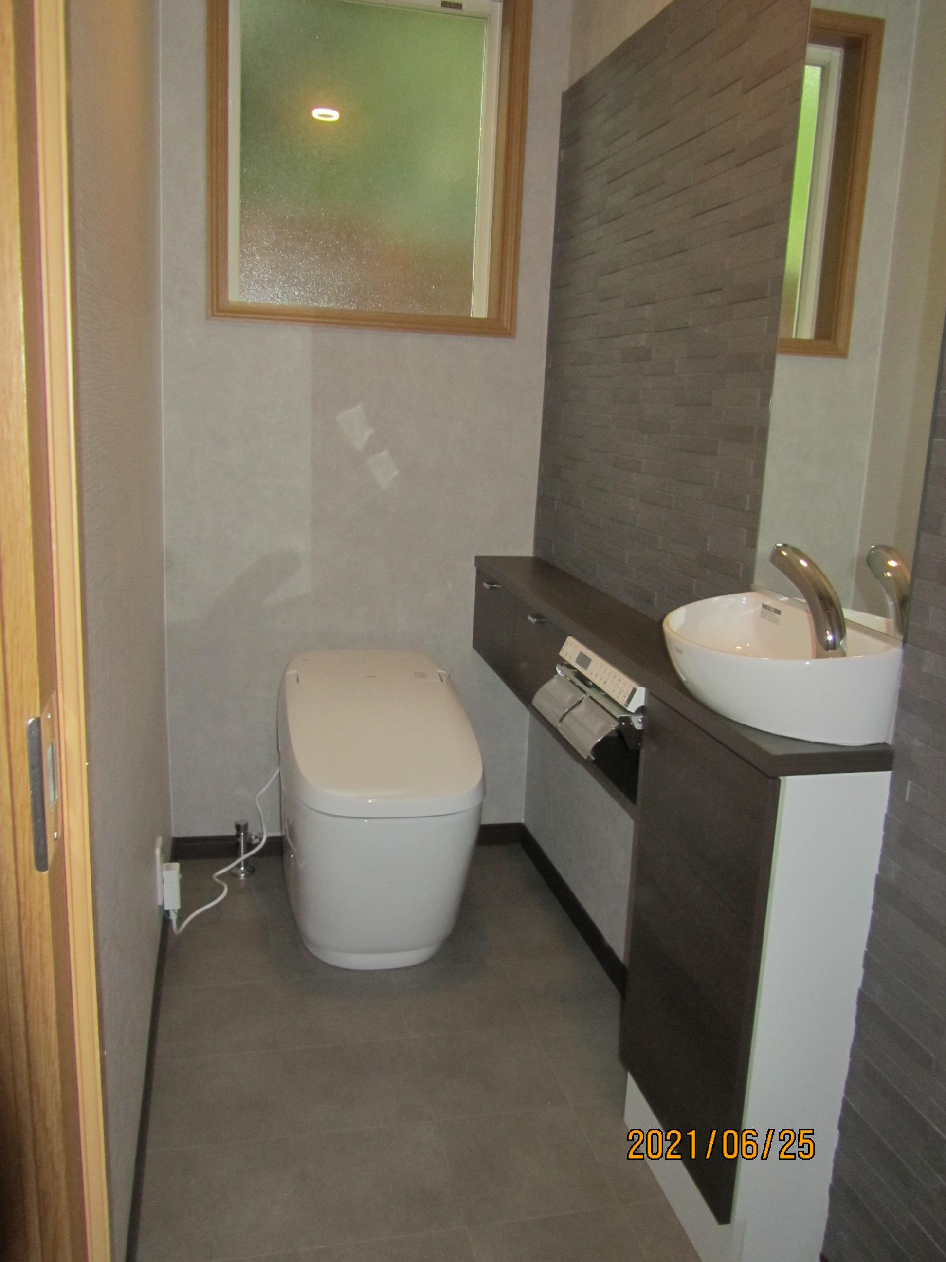 収納機能を持った手洗いをトイレ内に設置されたいとの御相談を頂きました。 商品はすべてお客様が選ばれ、色味もシックに統一。 落ち着きのある洗練されたトイレ空間になりました。 来訪のお客様にも喜んでいただけそうですね。