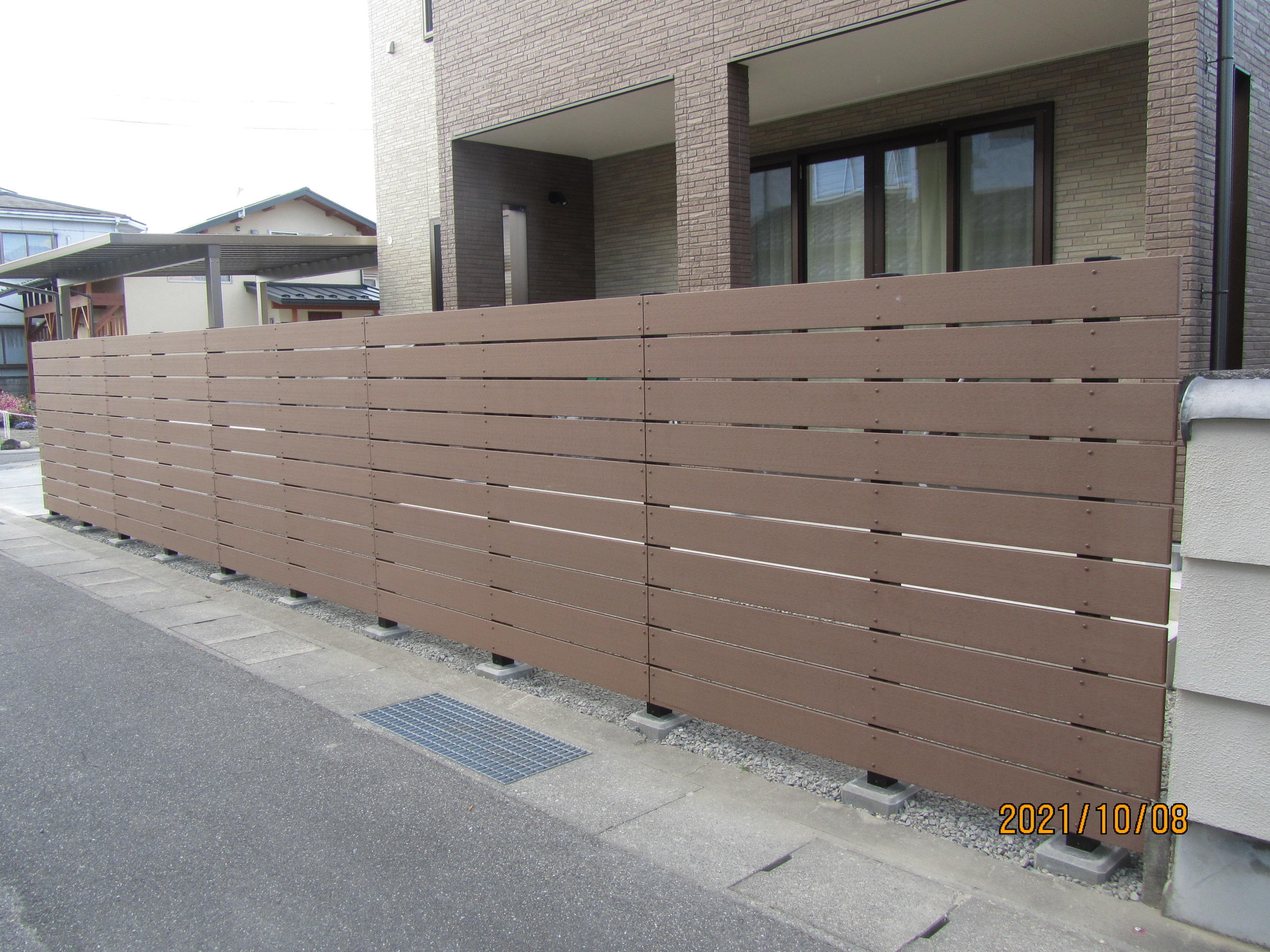 雰囲気もありメンテナンスしやすい木調の樹脂フェンスをお勧めしました。 張り方はお客様の御希望によってアレンジでき、隙間を1cmの全面張りにしました。