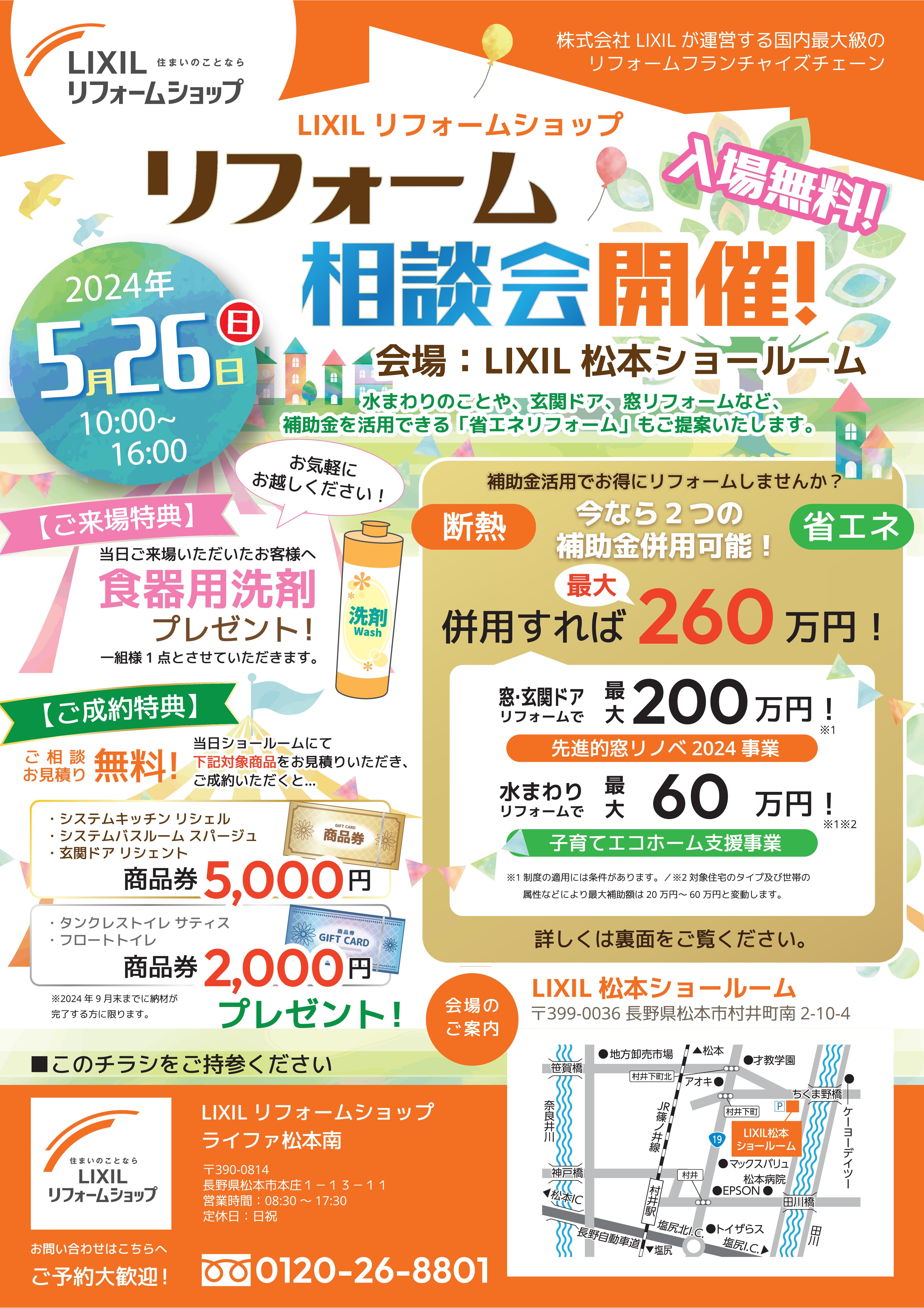 5月26日 日曜日にLIXIL松本ショールームにて「リフォーム相談会」を開催いたします。