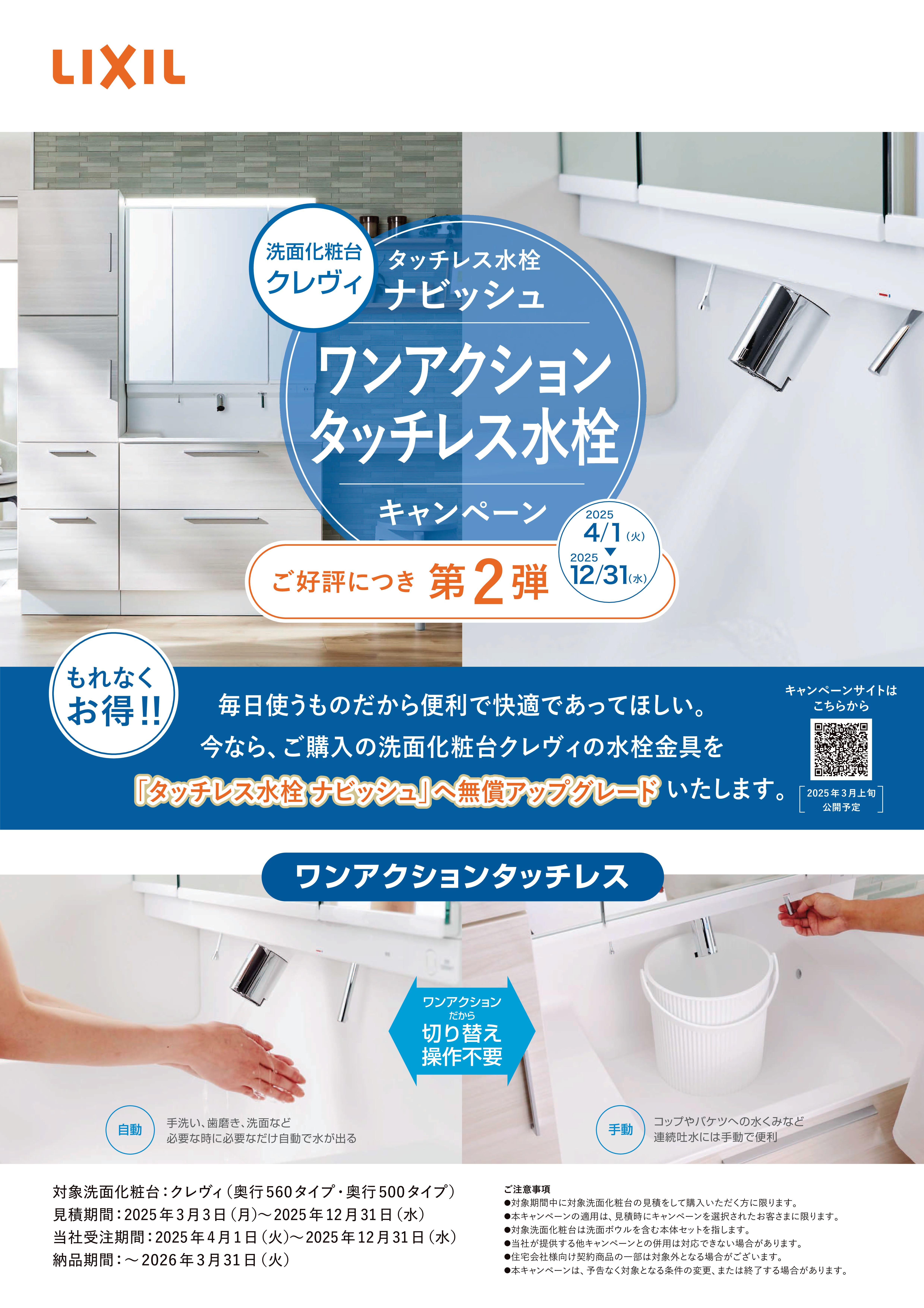 前回ご好評頂いたLIXIL洗面化粧台クレヴィのワンアクションタッチレス水栓キャンペーンの第2弾が始まります。