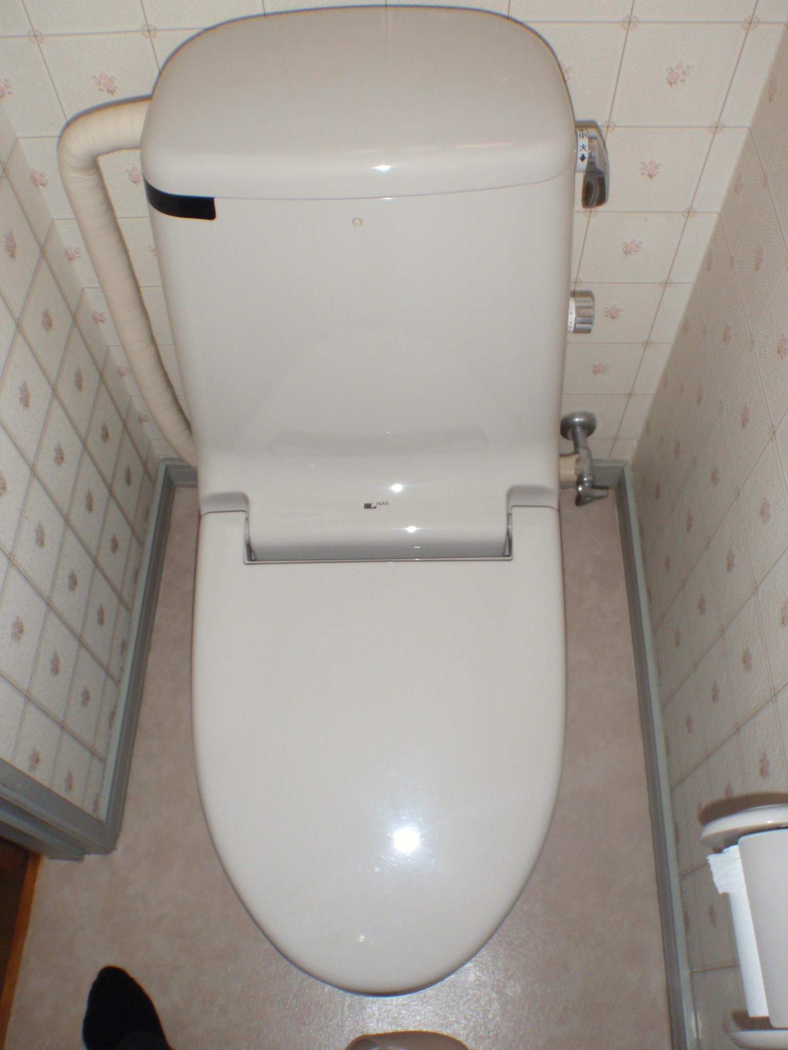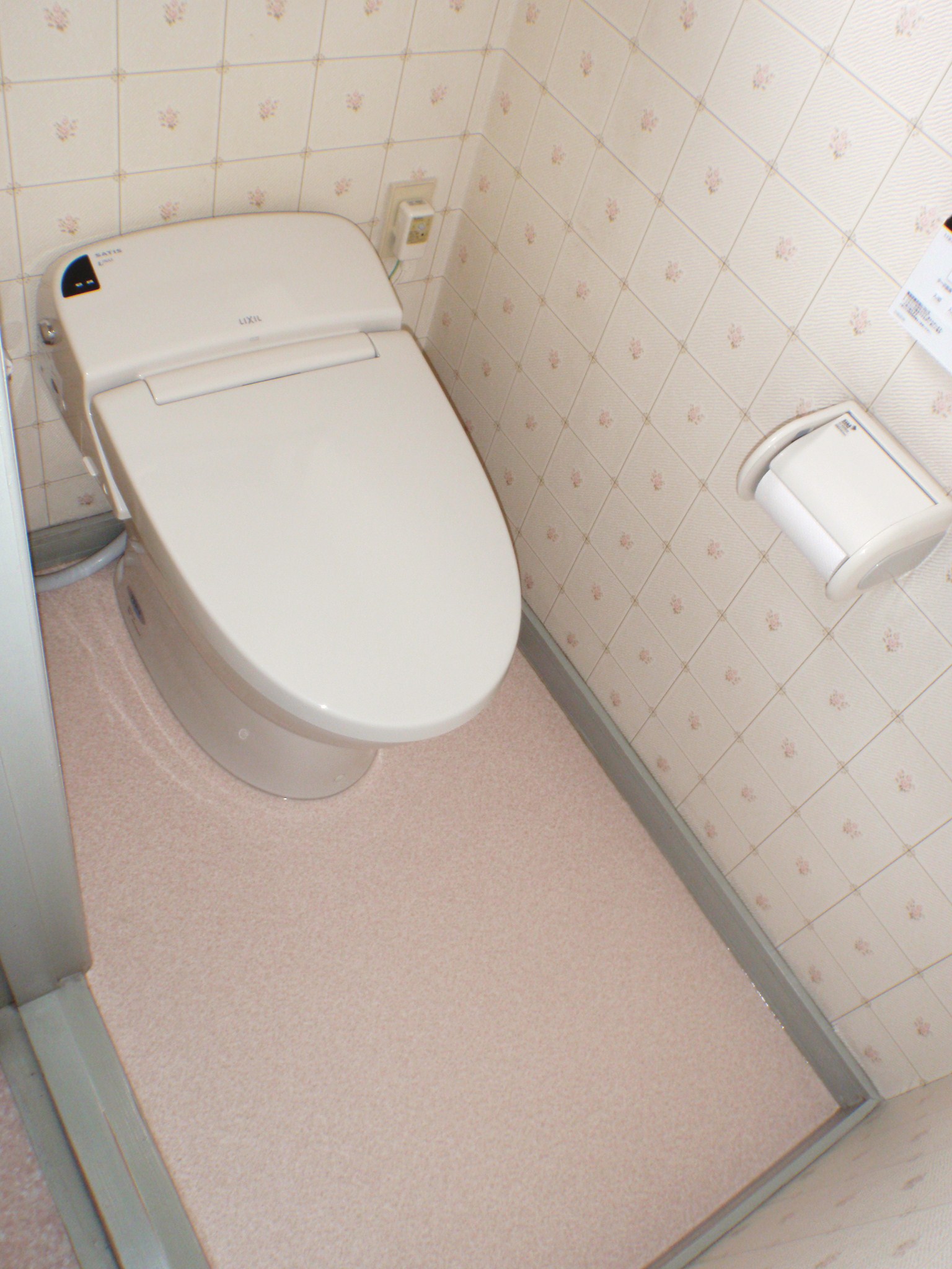 こちらは、既存トイレが故障した事がきっかけになり、トイレのプチリフォームという事で、最新のタンクレストイレを設置した事例です。写真からも分かりますが、タンクレスなので、便器の位置が後ろに下がり、トイレの空間が広くスッキリしました。床のCFシートも同時に張替えたので、非常にキレイな仕上がりとなりました。