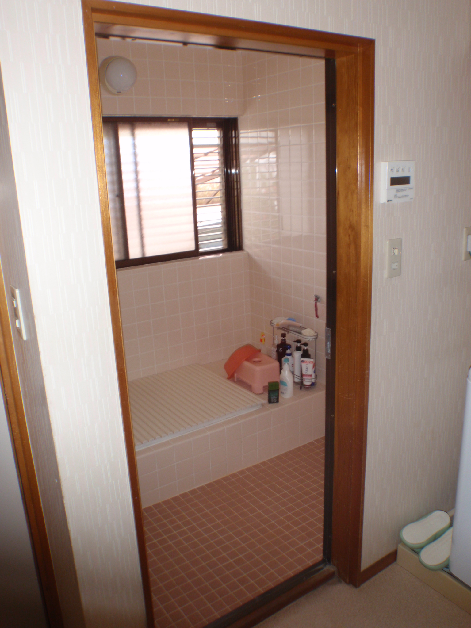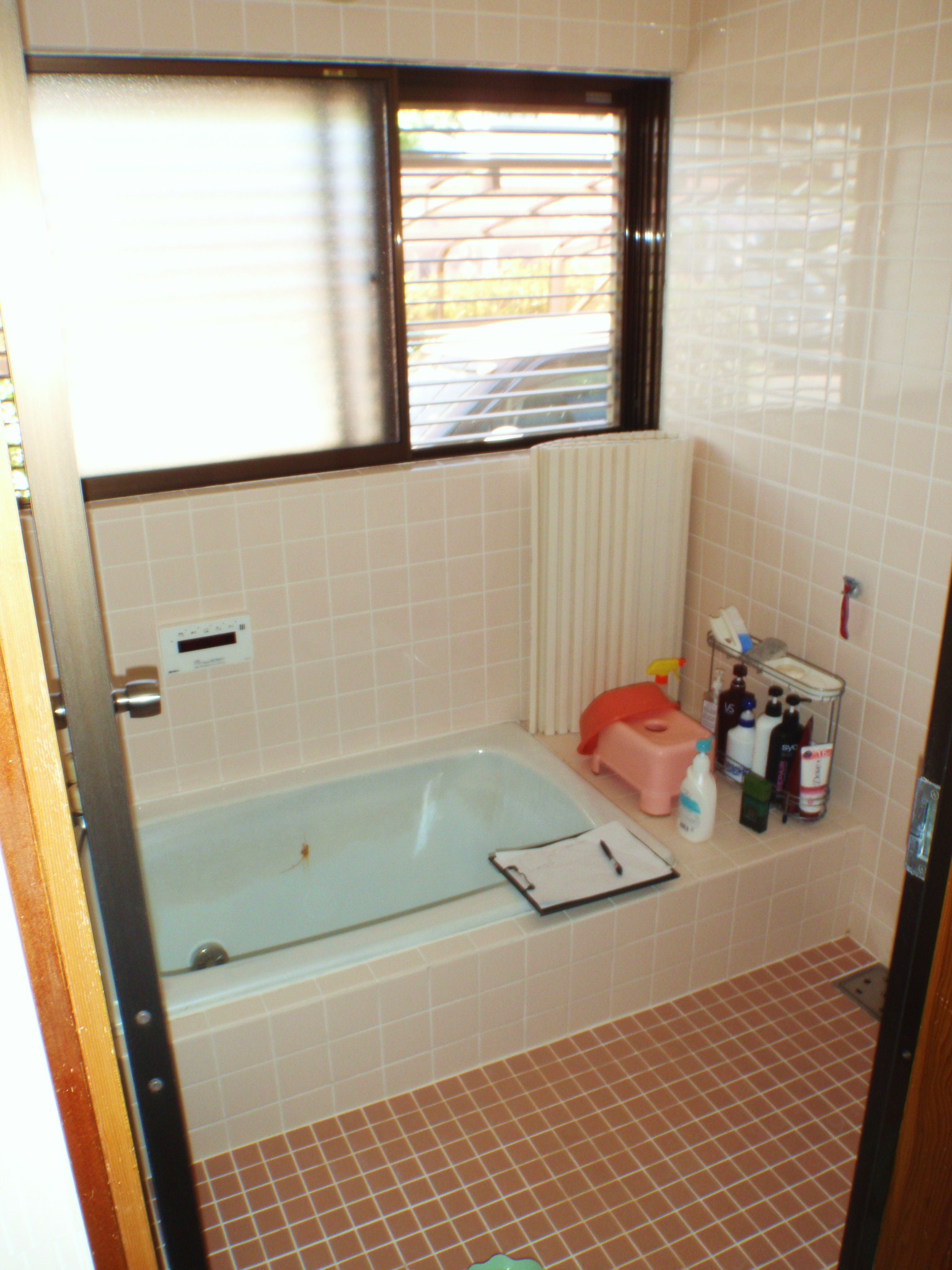 既存浴室。タイル目路やコーキングの傷みが目立つ状態でした。