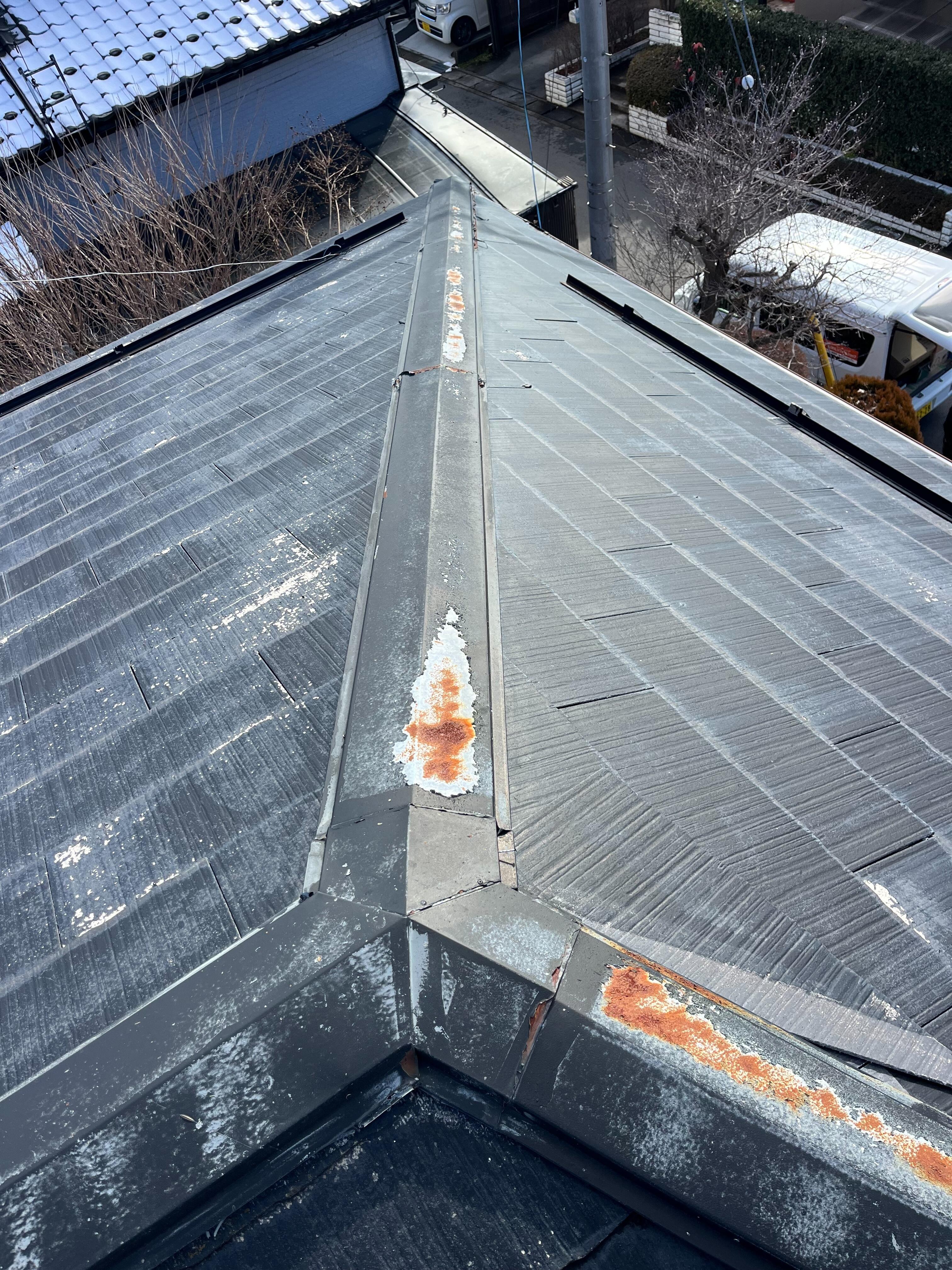 弊社とは違う知らない業者から「屋根が剥がれている」という指摘を受けたK様。今のご時世そういった詐欺が流行っていると知りつつ心配になり、弊社へご相談いただきました。Beforeの通り赤くさびているのが確認できました。