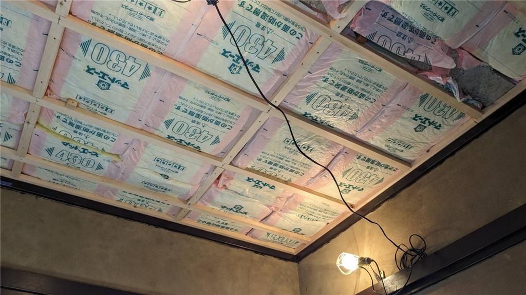 天井の下地を組んで、断熱材を敷き詰め