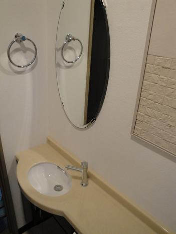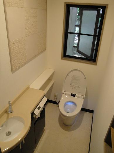 4L節水型のトイレへ入替えたいことと、手洗器を広く設置したいとのことから、デザイン性の溢れるエレガントなトイレにしました。壁にはカビや臭いを吸収する「エコカラット」を貼り、機能性とデザイン性を重視。照明をダウンライトにすることで、落ち着いたイメージのトイレに仕上がりました。