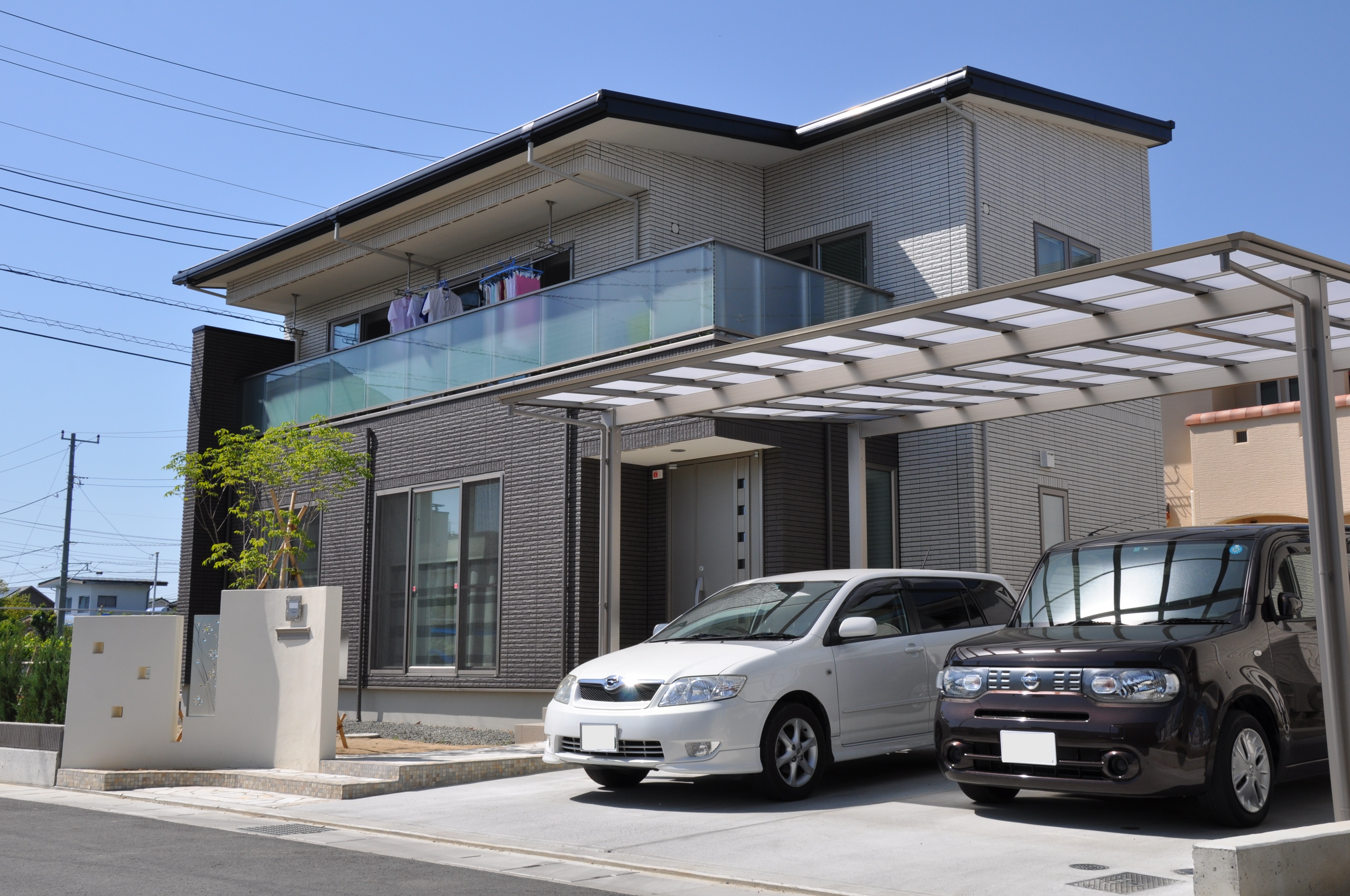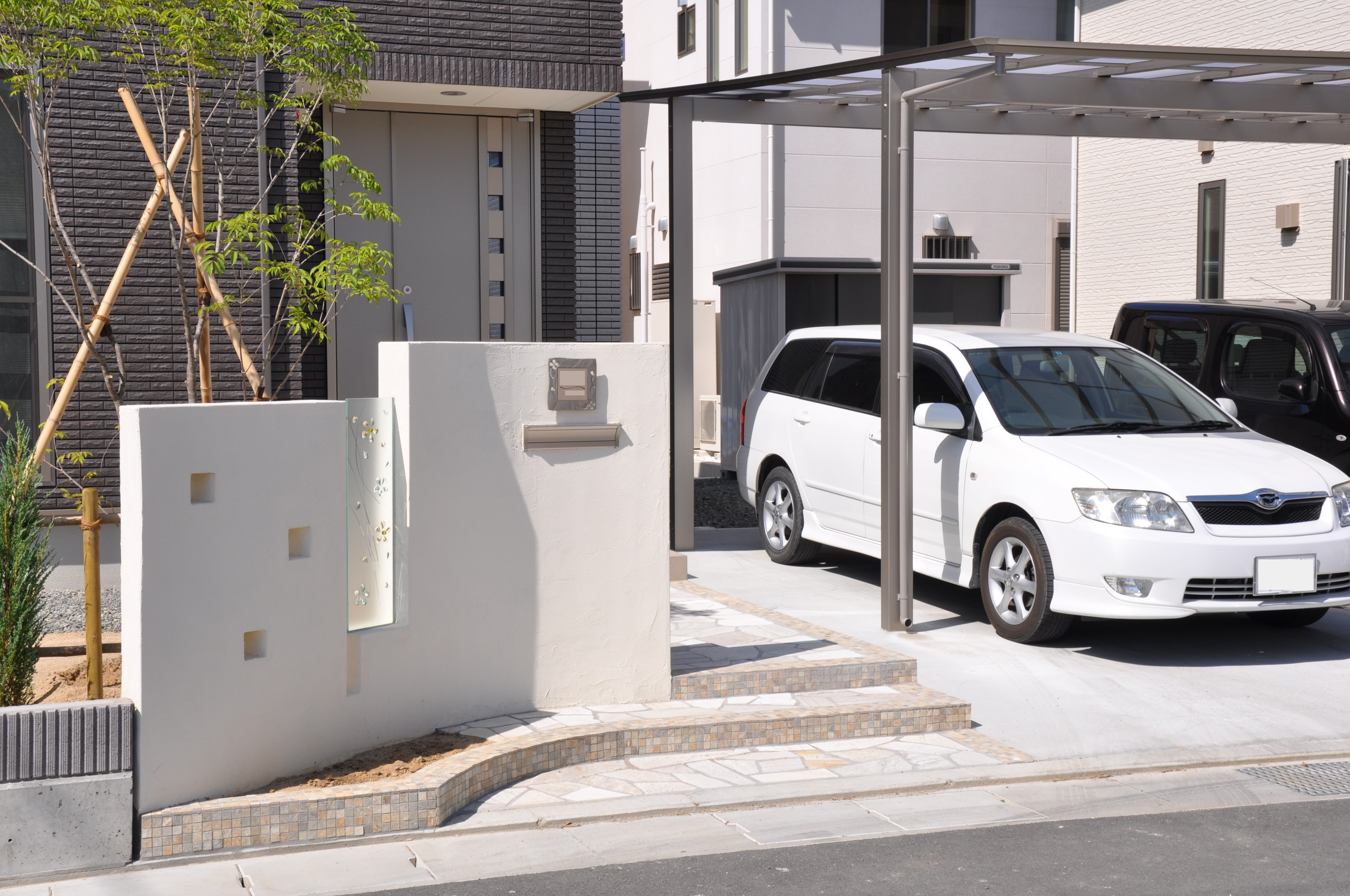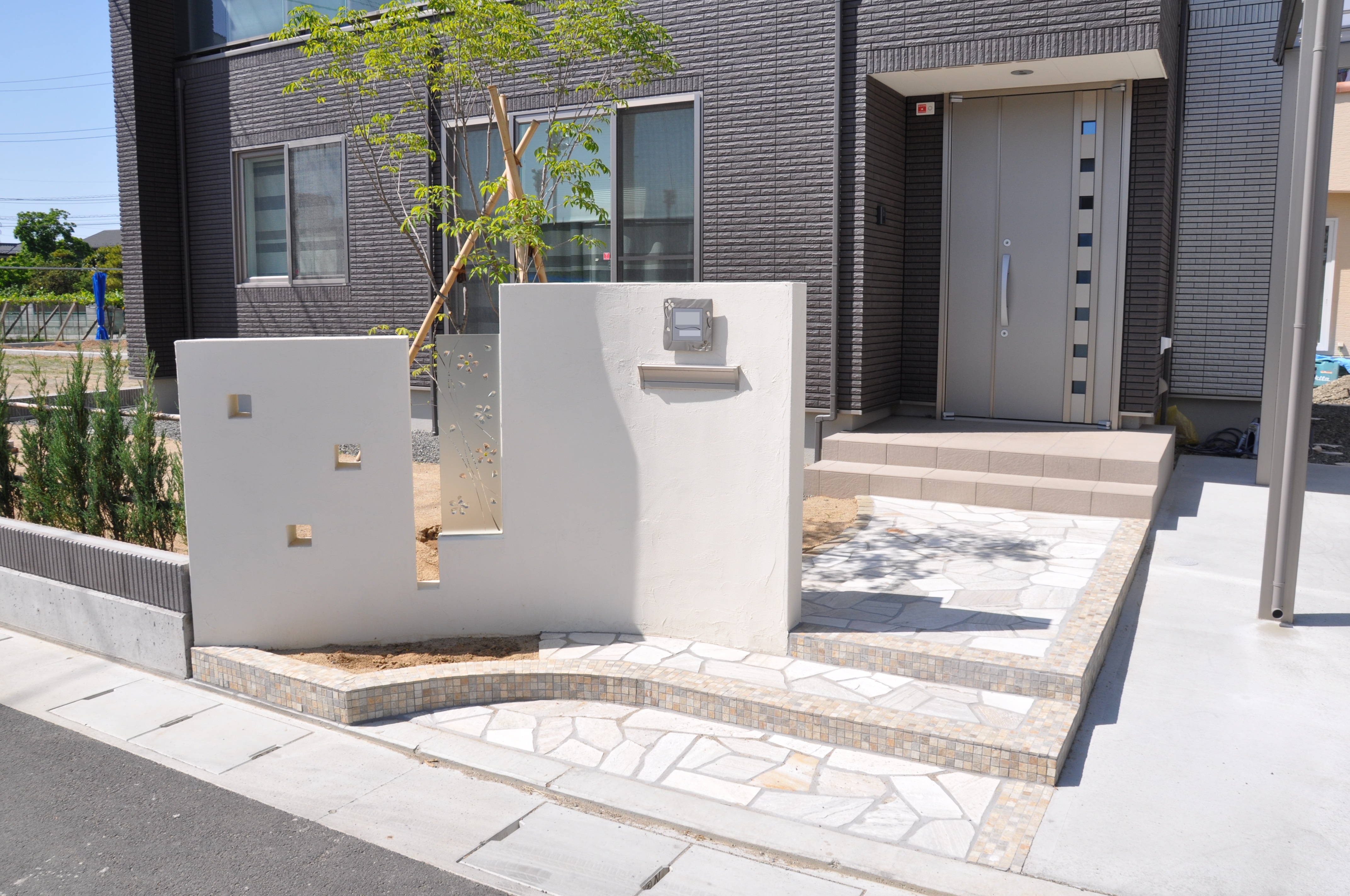 建物はモダンな雰囲気ですが、玄関まわりは閉鎖的にならないよう、柔らかいイメージにしたいとのご要望でした。 袖壁はR形状で塗り壁にて仕上げ、アクセントとして花柄のガラスパネルを設置しました。 アプローチ部分も袖壁と連動するするようにR形状を取り入れ、乱形石張りと縁を可愛いモザイクタイル張りにて仕上げました。 動きのある優しいデザインの玄関アプローチとなりました。