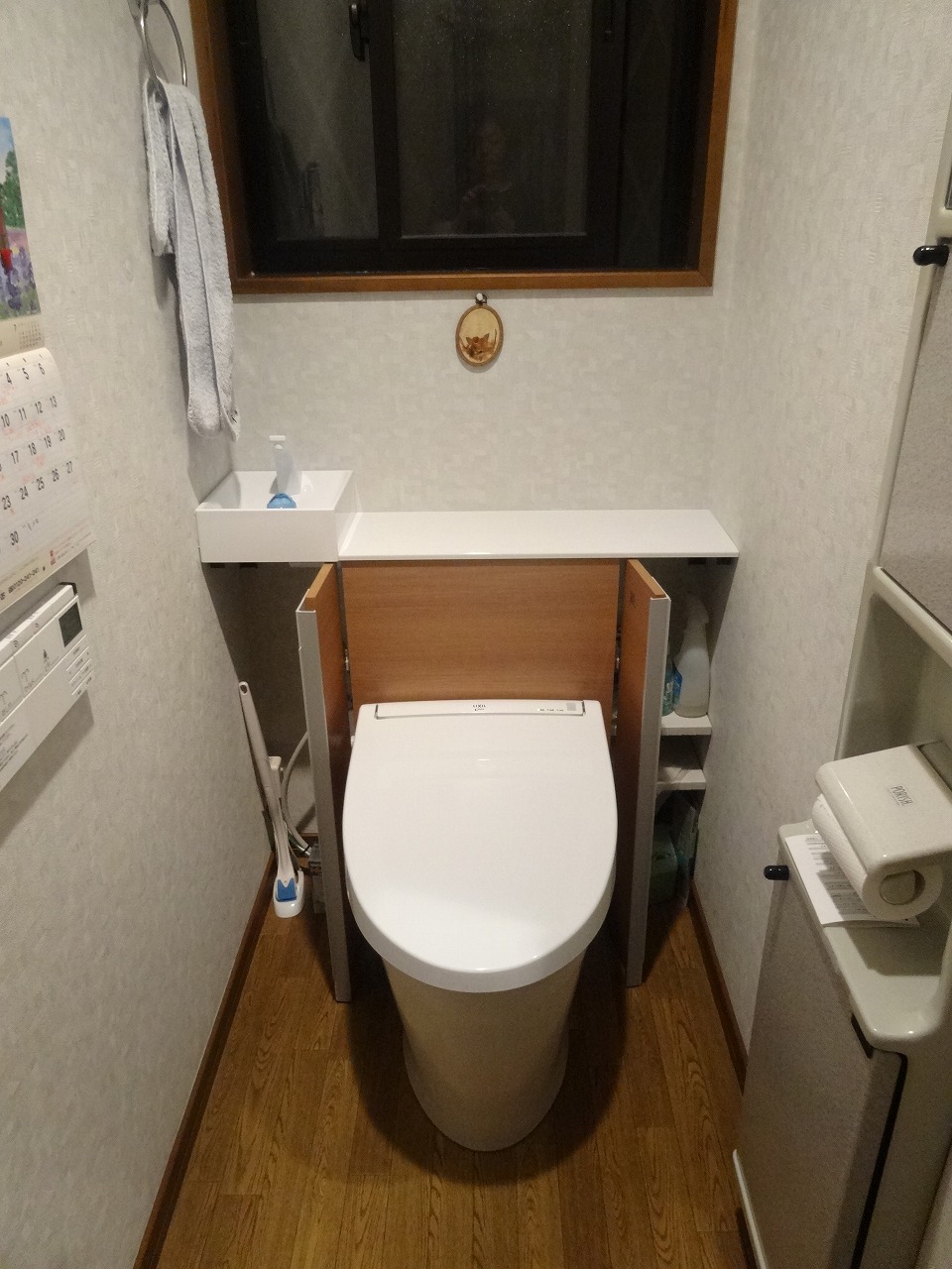 節水を目的にトイレの入れ替えを検討していましたが、収納のついたトイレを紹介され、気に入りました。 内装は何もしてないのに、トイレ空間がスッキリして素敵に、とても落ち着きます。 お手入れも楽になったし、かわいい手洗もついて、使いやすくなりました。満足です。