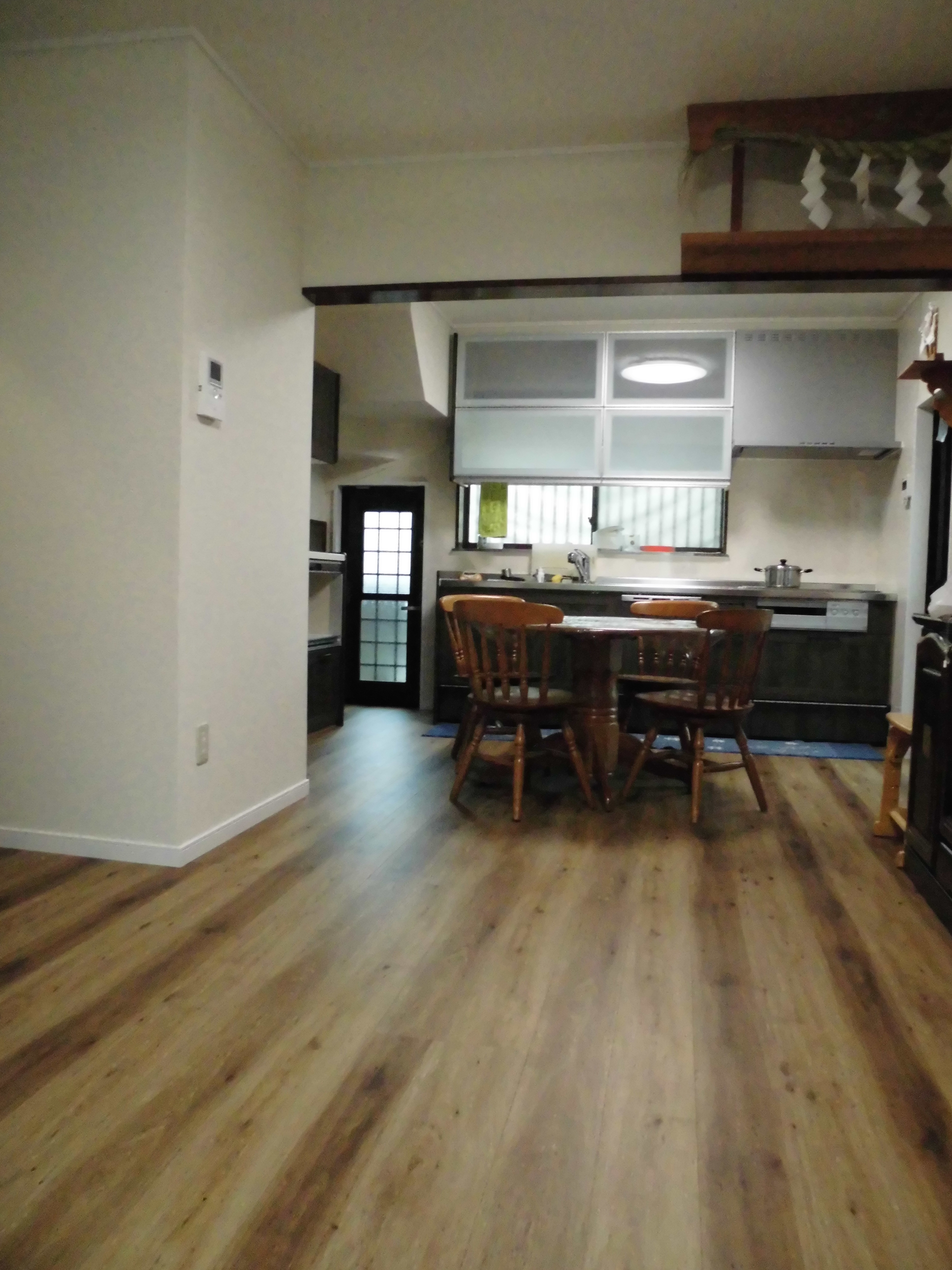 奥様の好みを反映し、床や室内ドアなどをシャビーテイストに仕上げました。玄関側へリビングを広げましたが、玄関が狭くならないように考慮し、使い勝手の丁度よいスペースにしました。キッチンは収納を置くと狭くなる為、吊戸棚などに調理小物を置くスペースを多く設けました。浴室やトイレの色柄もリビングの内装に合わせ、全体的な統一感を出しました。
