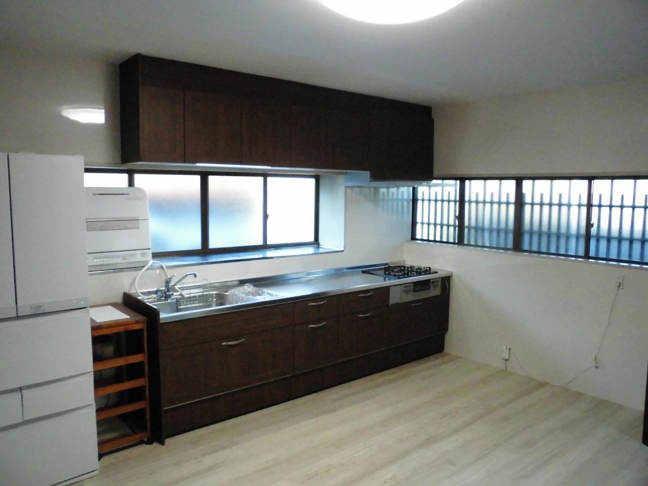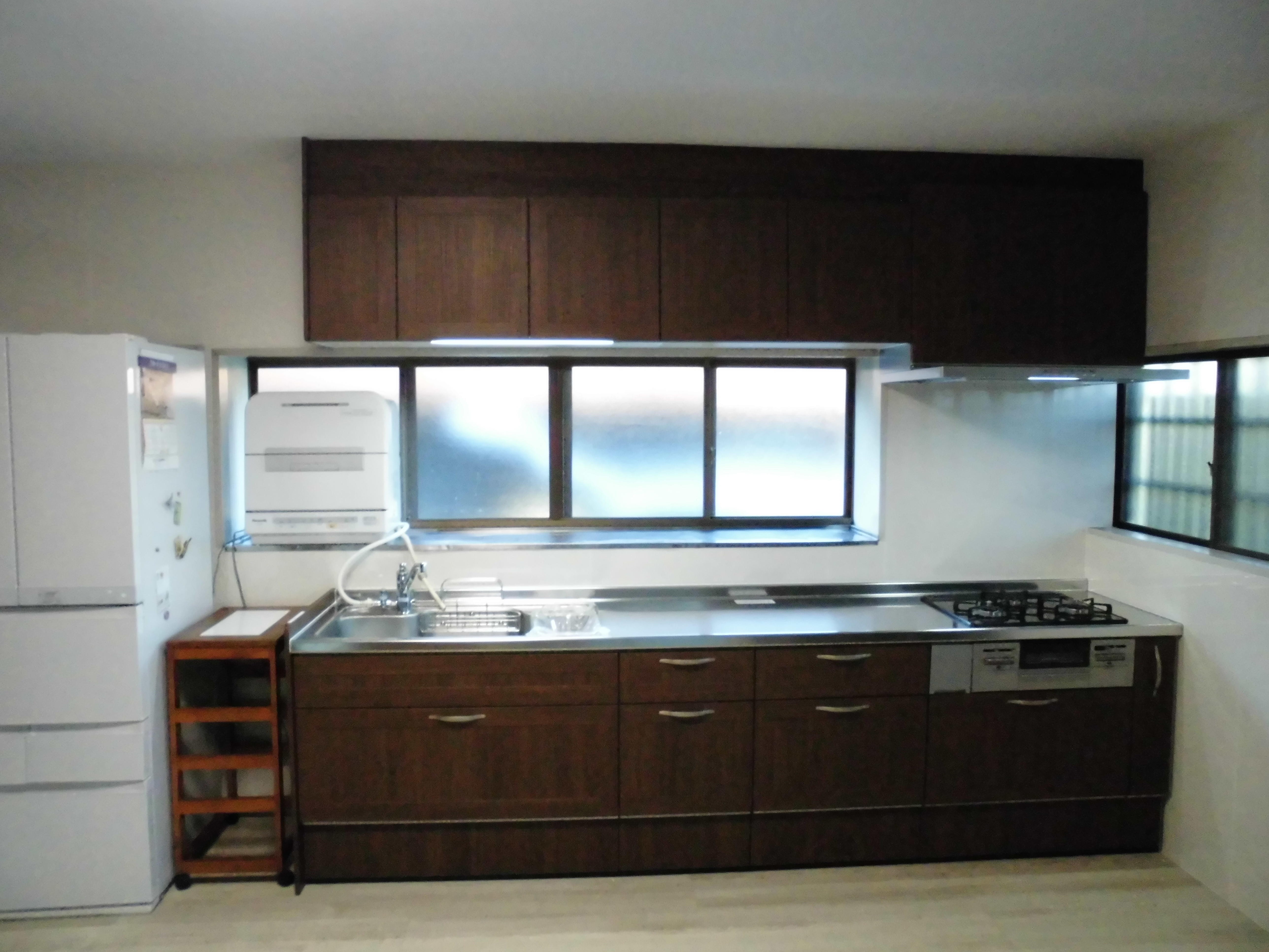 長年使用してきた流し台を最新のシステムキッチンに入れ替えました。インテリアは壁・床を明るい色に張り替え、キッチンは濃い色にを選びました。白を基調にしたインテリアとブラウンのキッチンのコントラストが素敵なキッチン空間になりました。