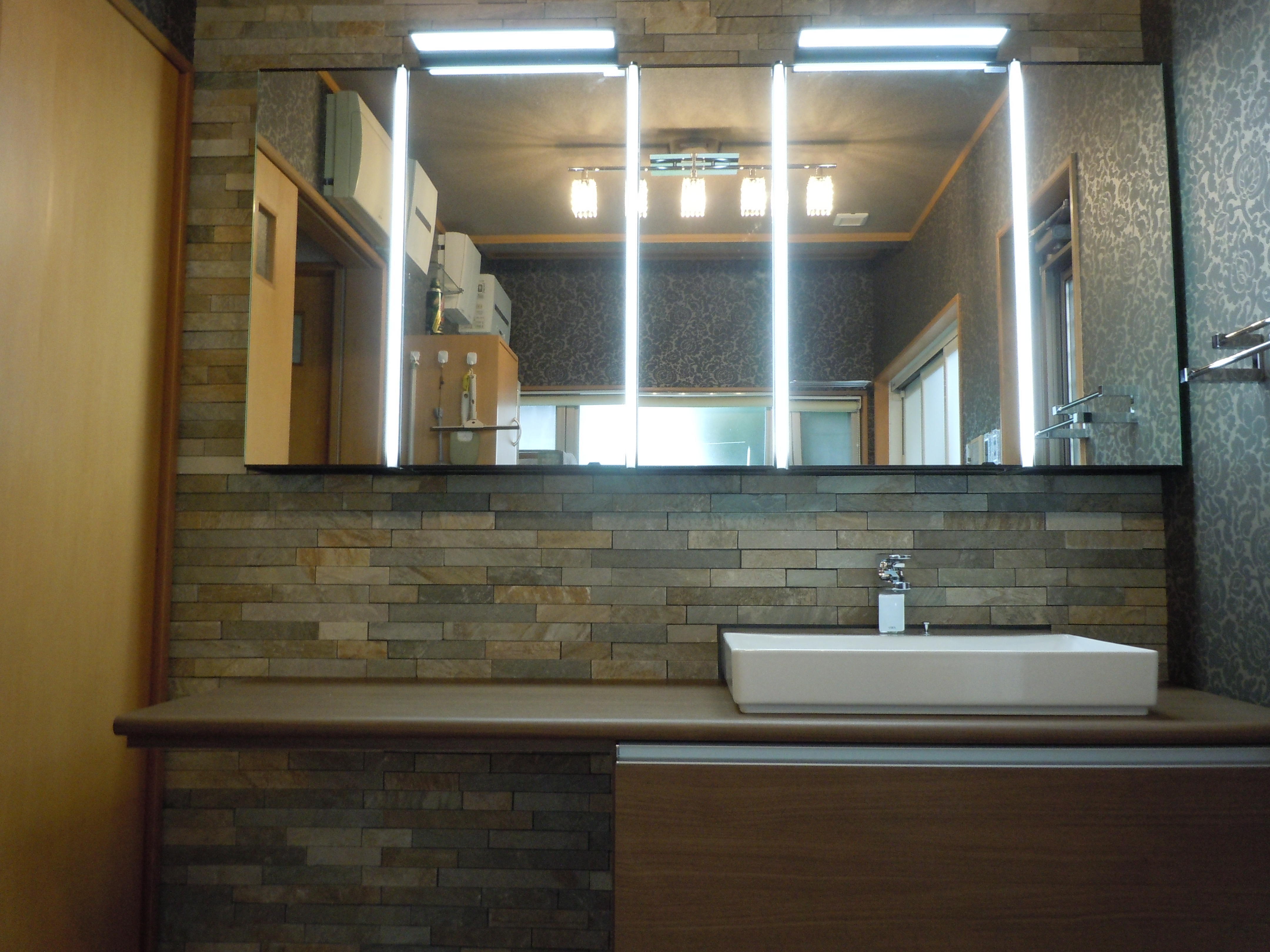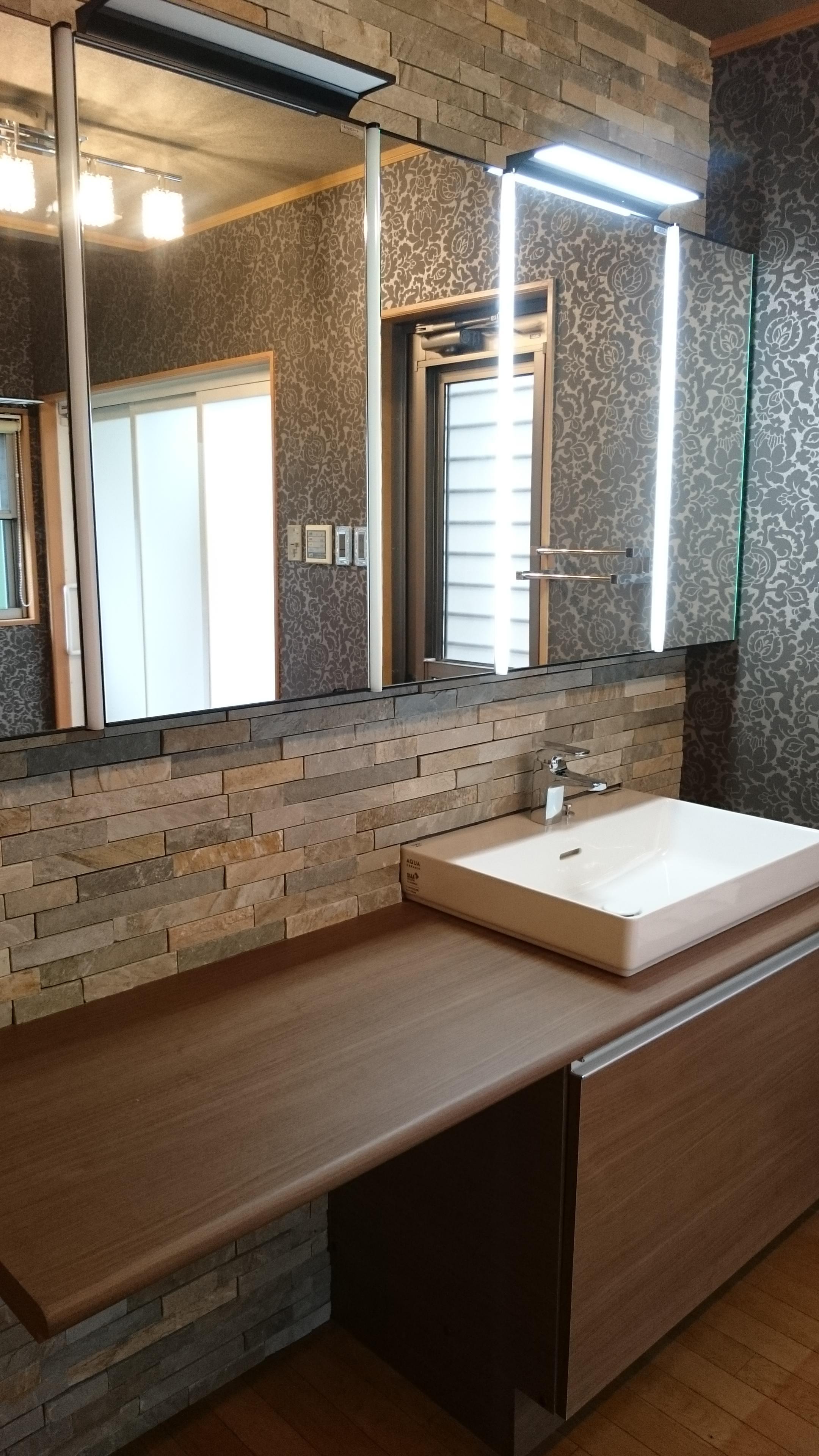 【洗面室リフォーム】(甲府市) ルミシスの2連ボウルタイプ用の5面鏡とエクセンシアの背面タイルを使った洗面室