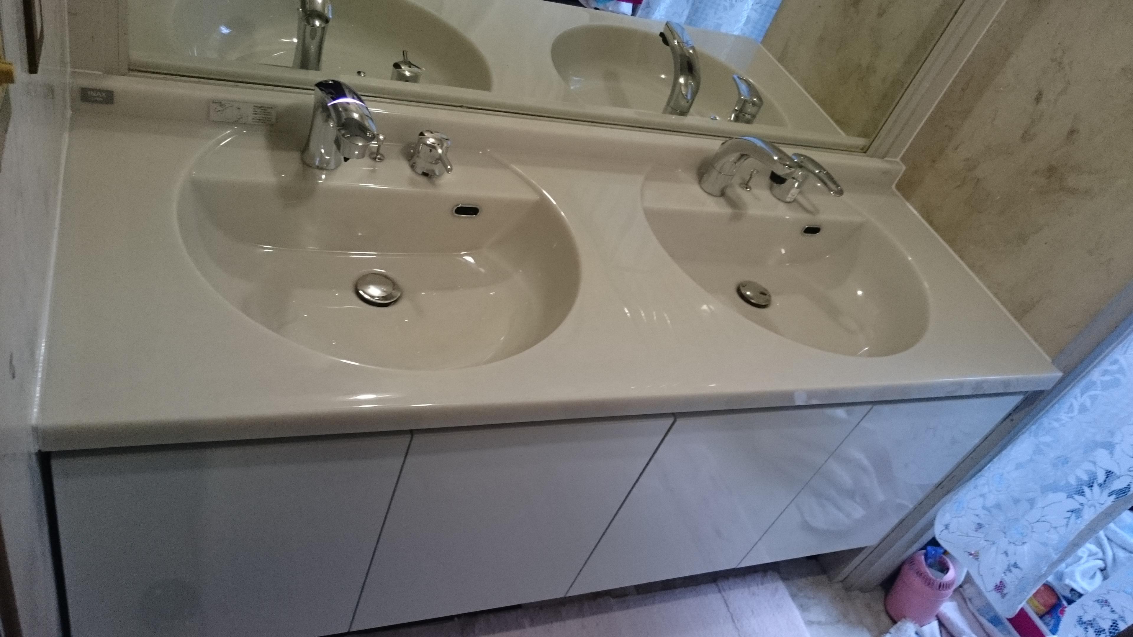 洗面ボウルが割れてしまったので、ボウルだけ交換してほしいとご依頼いただいたのが始まりでした。 ボウルだけの交換が難しい為、洗面台ごと入替させていただきました。 今回はリクシルの洗面台【ルミシス】の2連ボウルを採用しました。右がシャワー水栓、左が自動水栓となっております。 天板、扉とも白を基調とし、高級感ある空間に仕上がりました。
