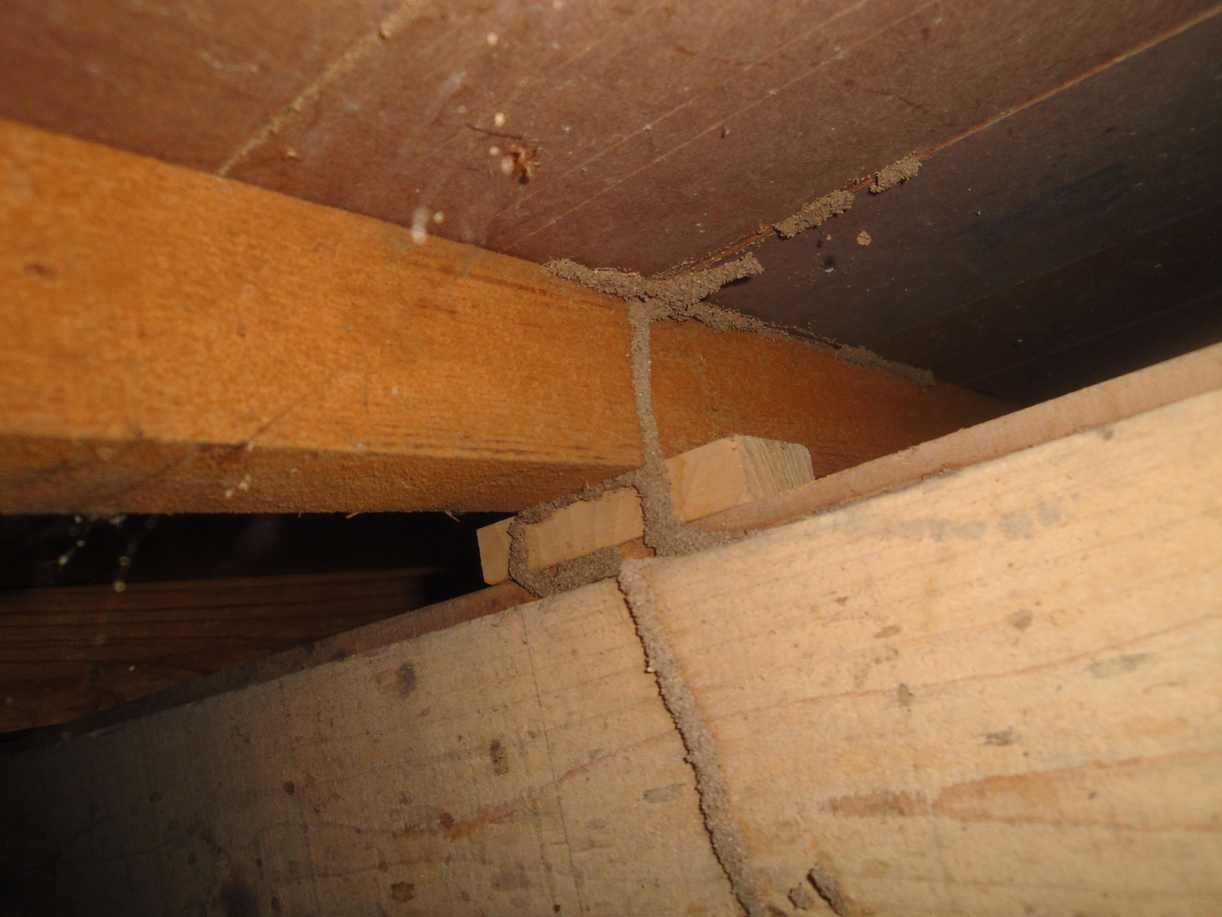 床下のシロアリ被害の症例です。シロアリの通り道【蟻道(ぎどう)】です。床下に写真のような形跡があると被害の可能性が大です! 被害箇所の木材を入れ替えた後、建物全体に消毒剤を散布し工事完了!無料保証が5年つきますのでご安心くださいませ。 皆さまのお宅に床下の点検口又は収納庫があれば一度確認してみてはいかがでしょうか?