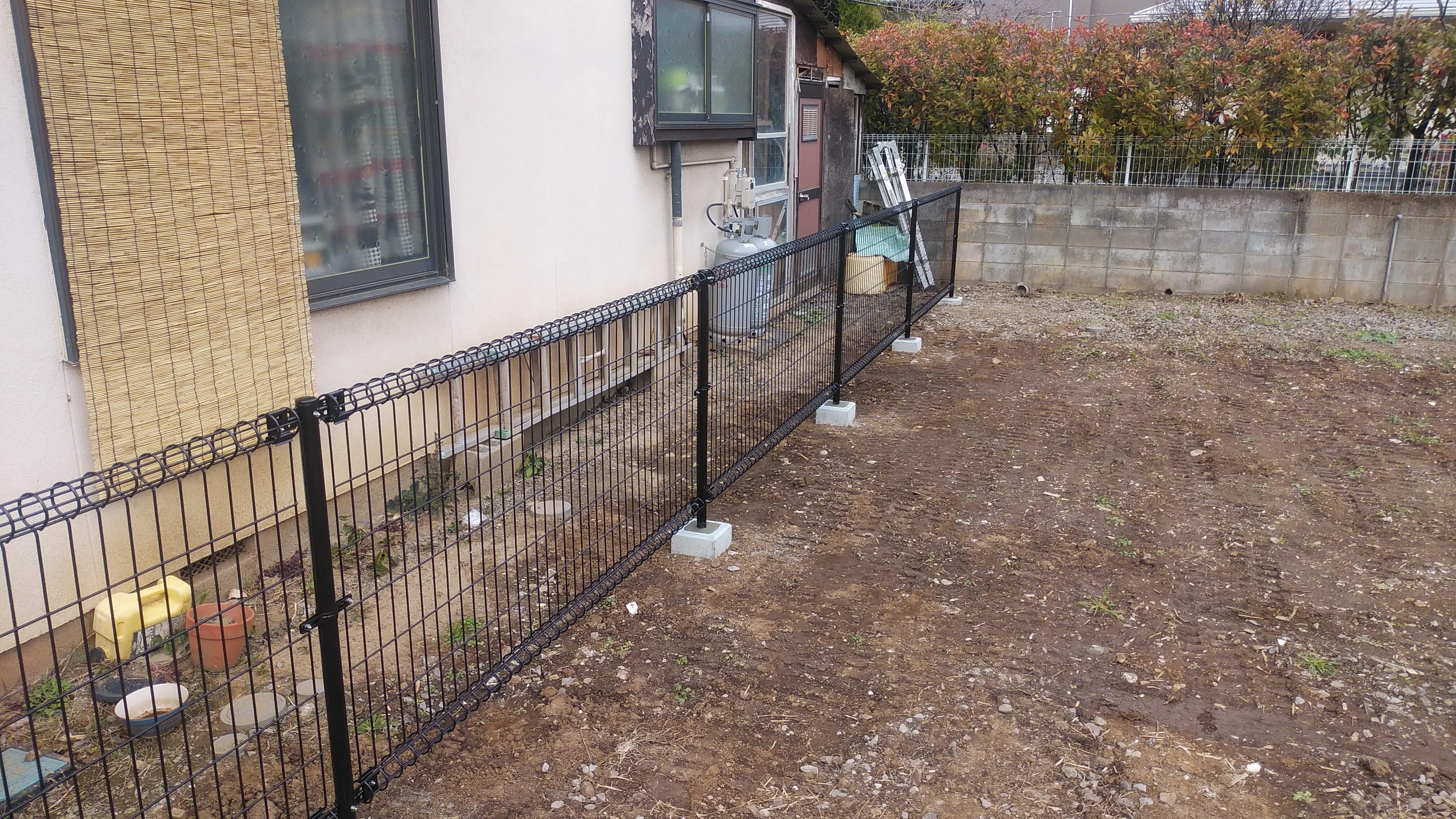 隣家との境界部分にフェンスを設置して、駐車場スペースに。簡易的な仕切りをご希望の為、LIXILのメッシュフェンス(ハイグリッドフェンス)を設置しました。