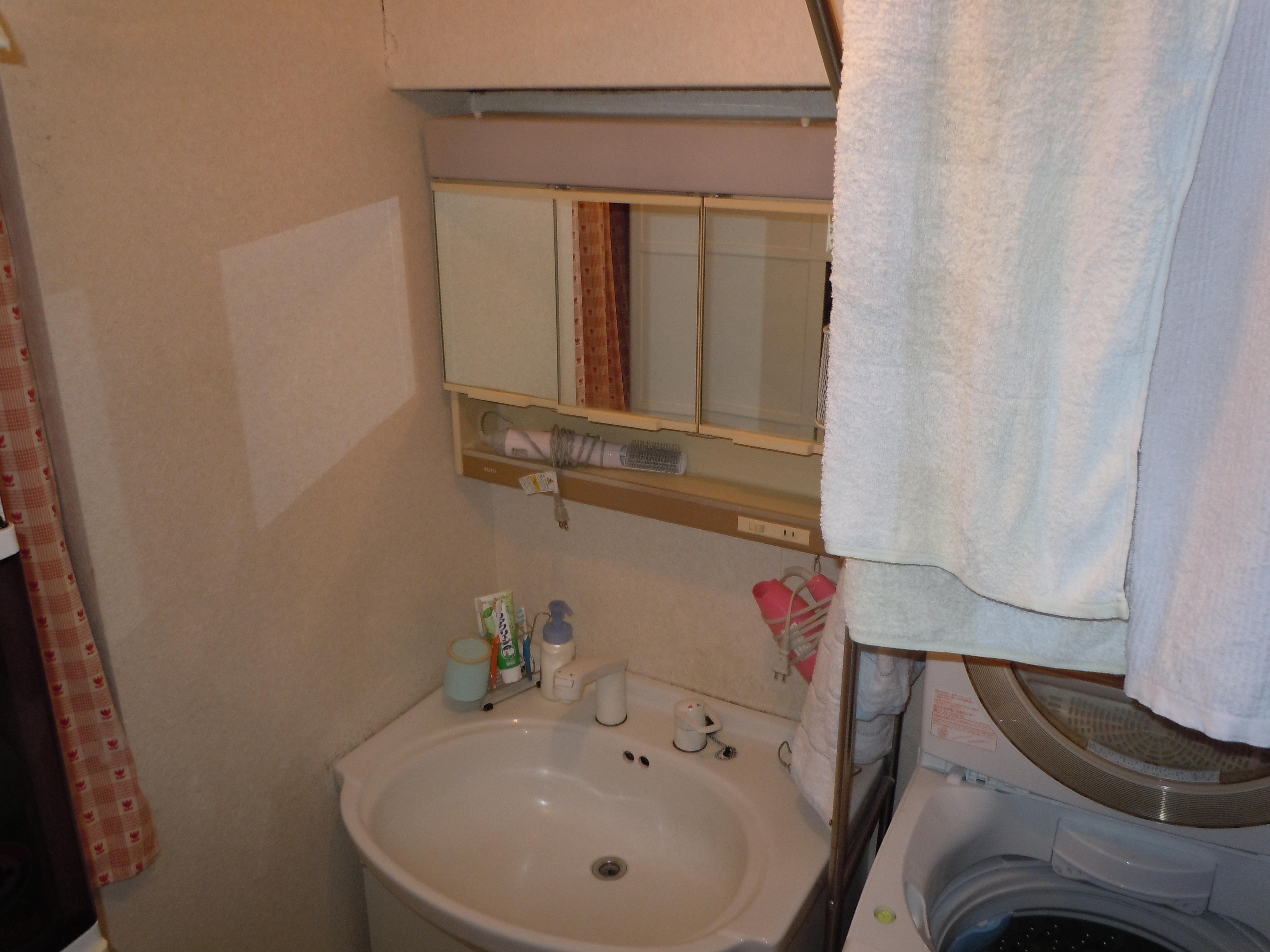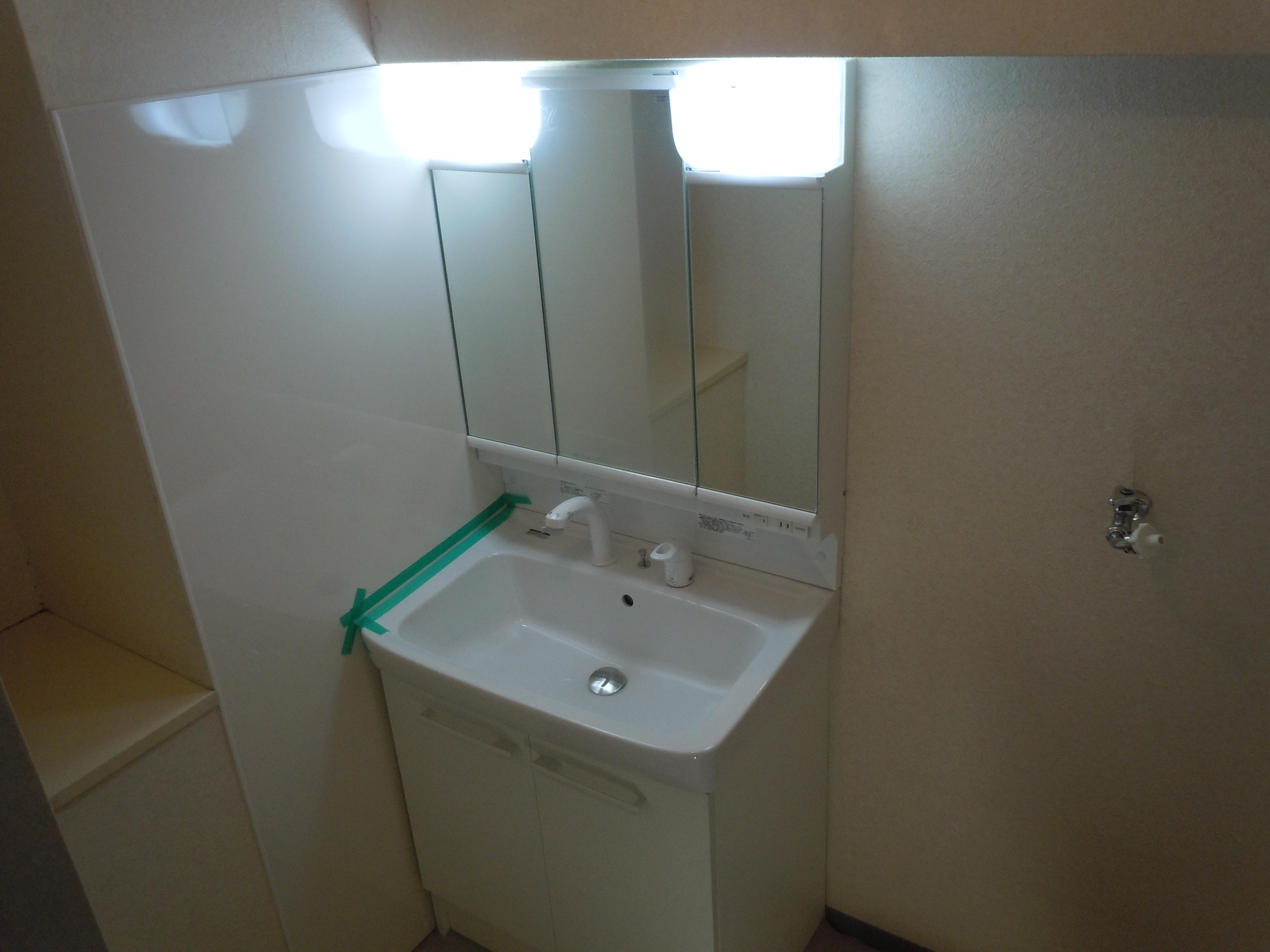 洗面台の入れ替えを行いました。 壁にはキッチンパネルを張って清掃性アップですね