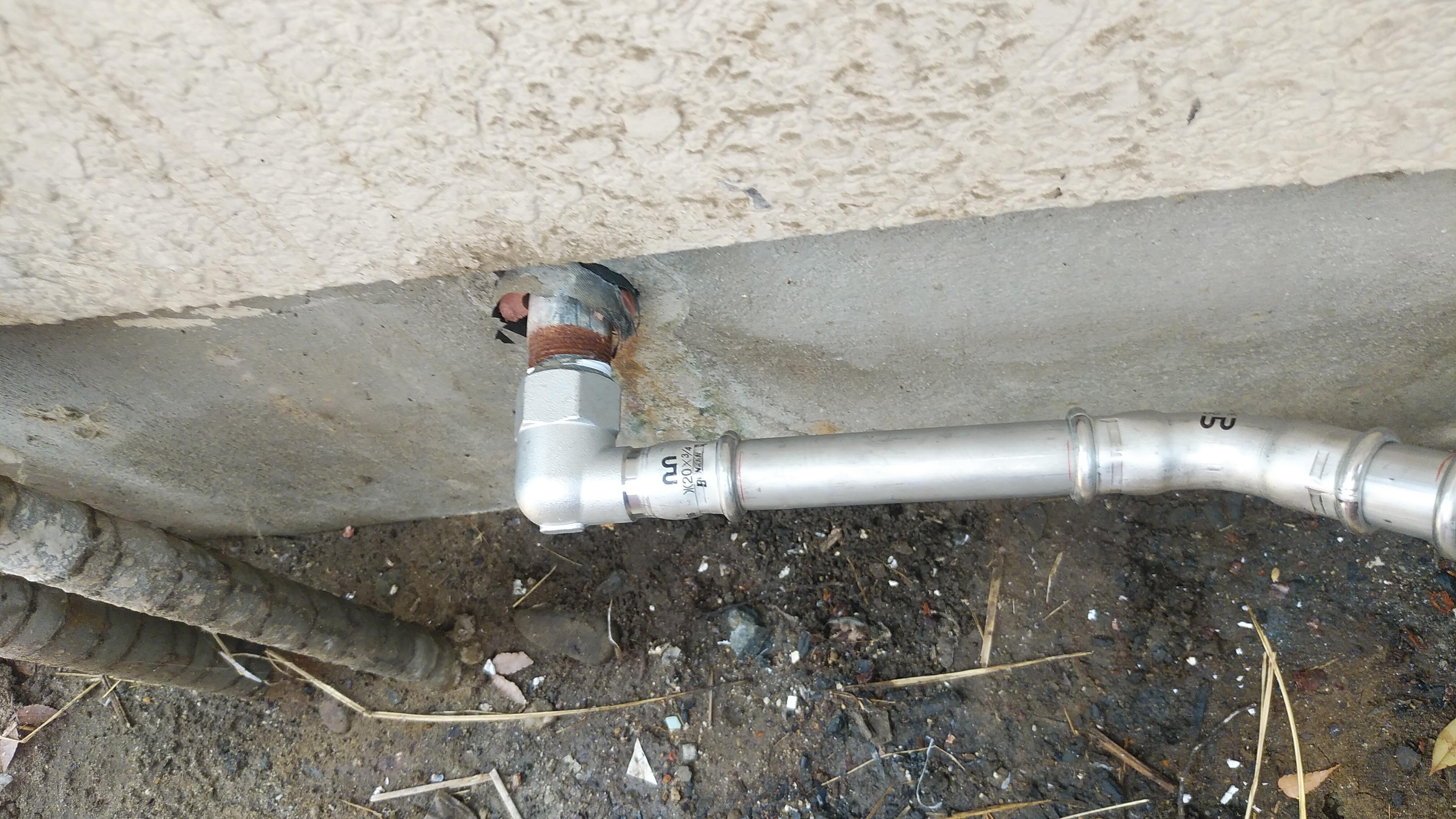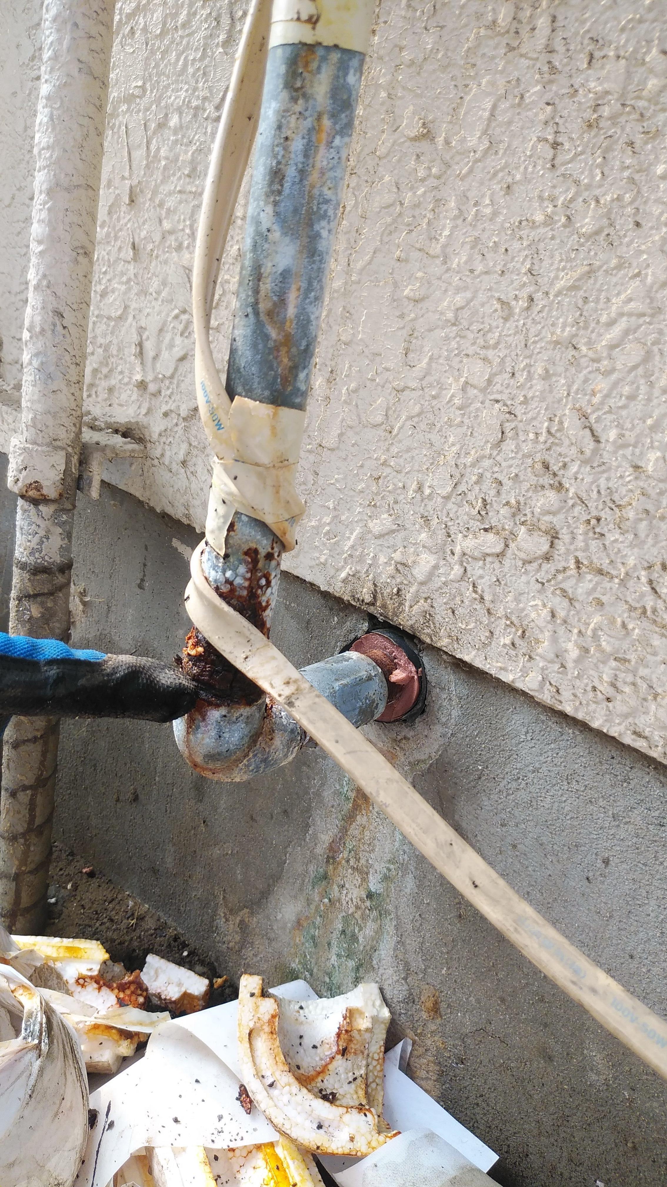たまたま家の裏を片付けていたら、基礎に苔が! お湯の配管が鉄でできており、そこに錆が発生し、水漏れが起こっていました。新しい配管はステンレスで錆に強くしました。