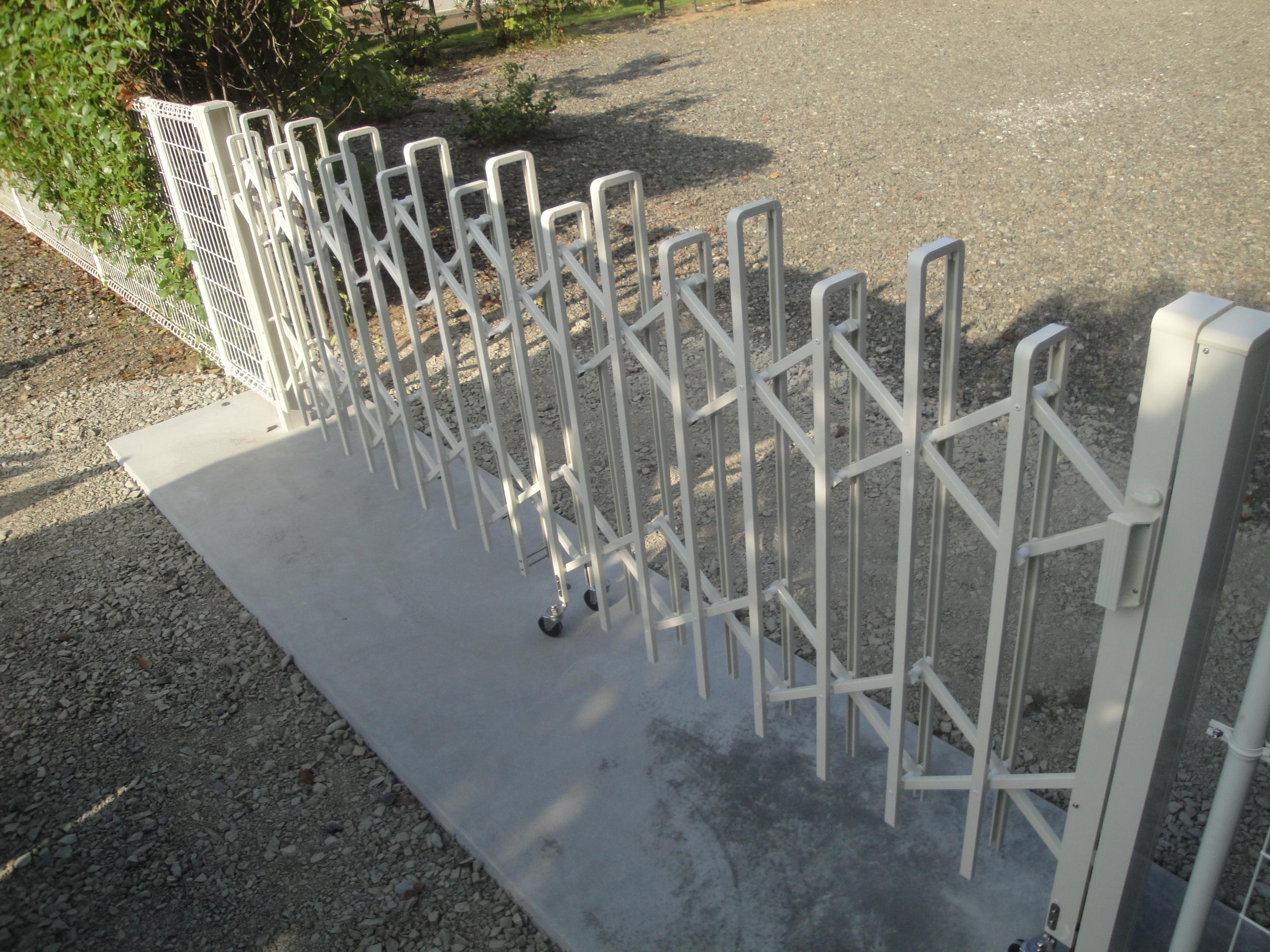 私有地に知らない車が入ってくるのを防止する為、伸縮門扉の取付けをしてきました(^^)/ 既存のフェンスと調和させるためにホワイトの門扉を採用し、キレイに仕上がりました(^_^)