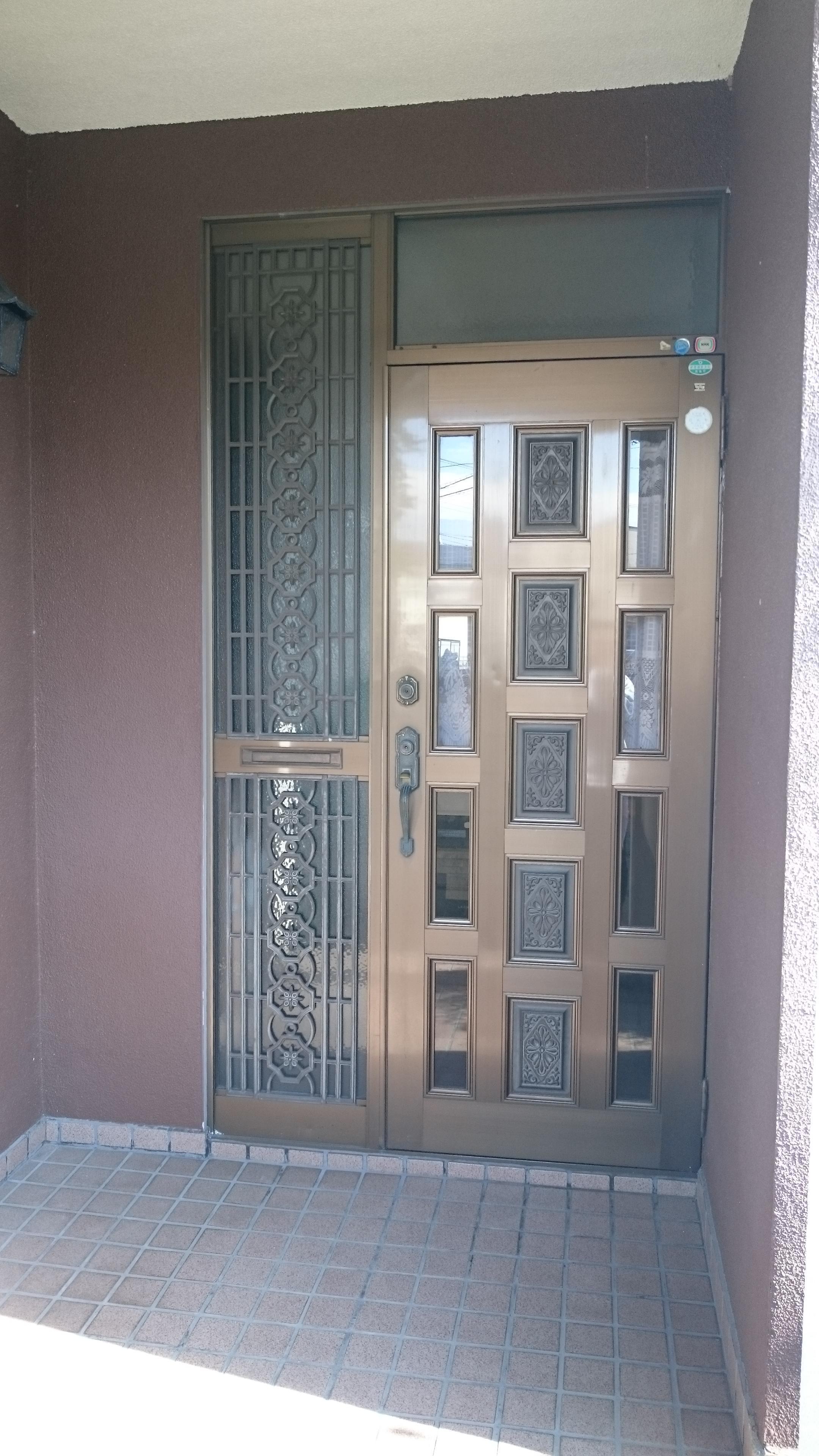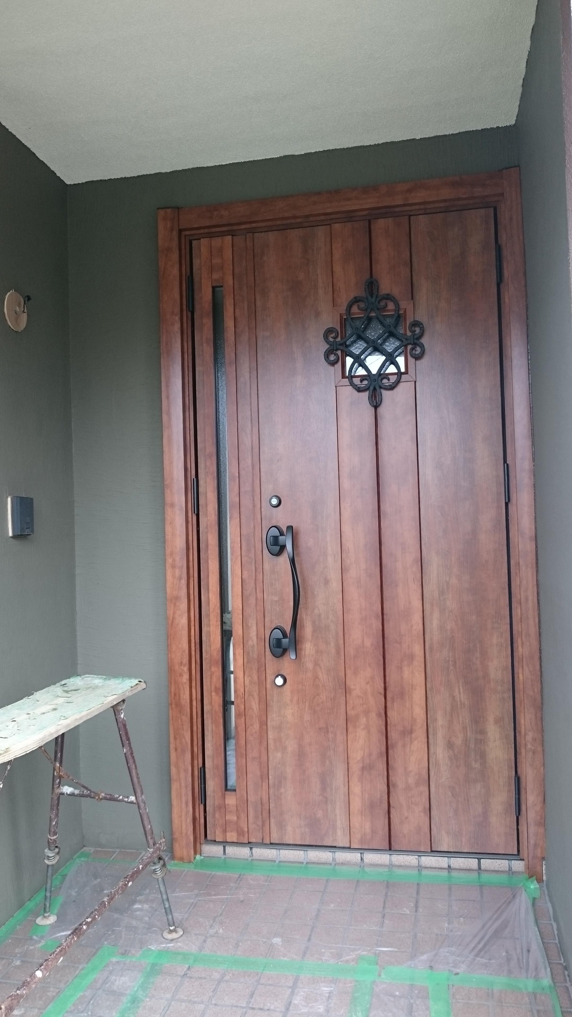 玄関ドア交換にあわせて、タイルを貼りました。 色合いやタイルの質感とも玄関ドアとマッチしていて素晴らしいおうちの顔に仕上がったのではないでしょうか?