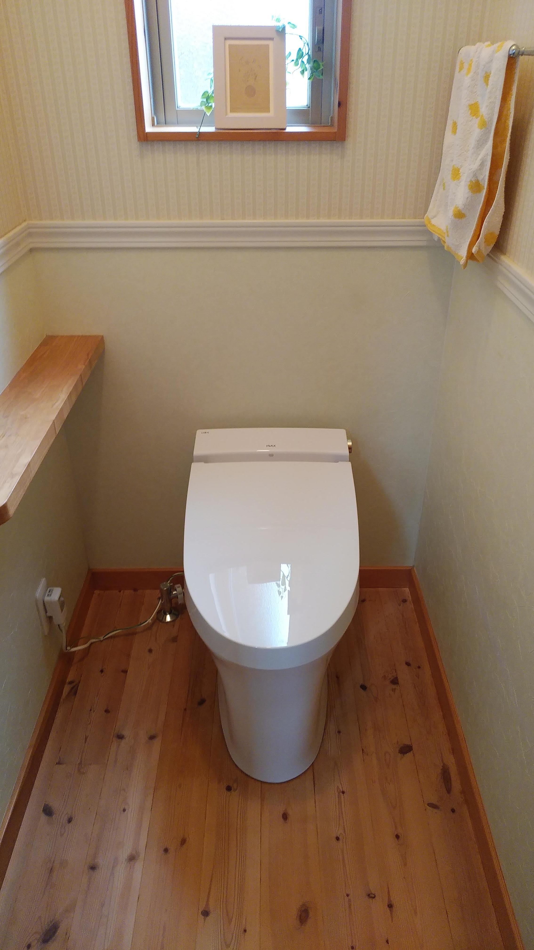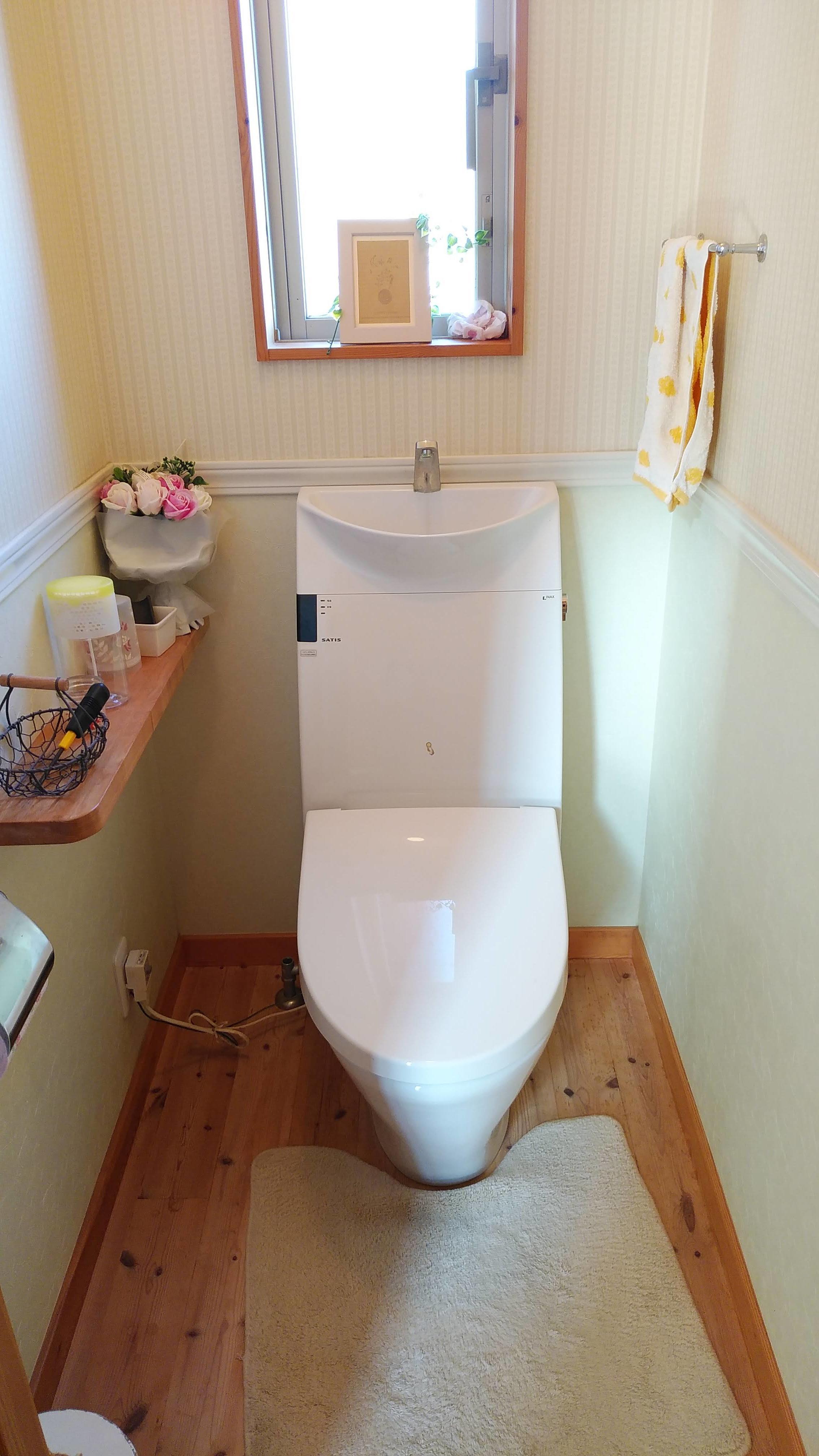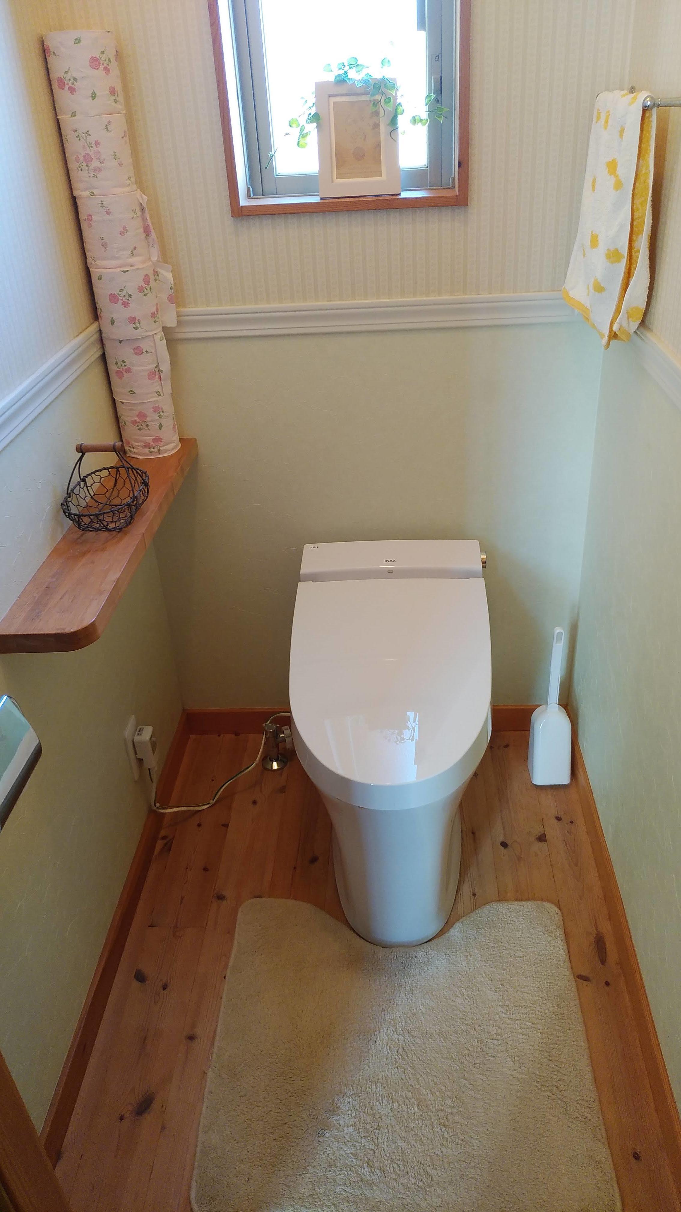 水漏れしてしまい、交換することになりました。 壁紙がキレイな色でしたので、リモコン取り付け位置を変えずに 壁の補修をしない方向で取り付けました。 元のトイレと大きさはさほど変わらないのですが タンクレストイレにすると、スッキリして見えますね