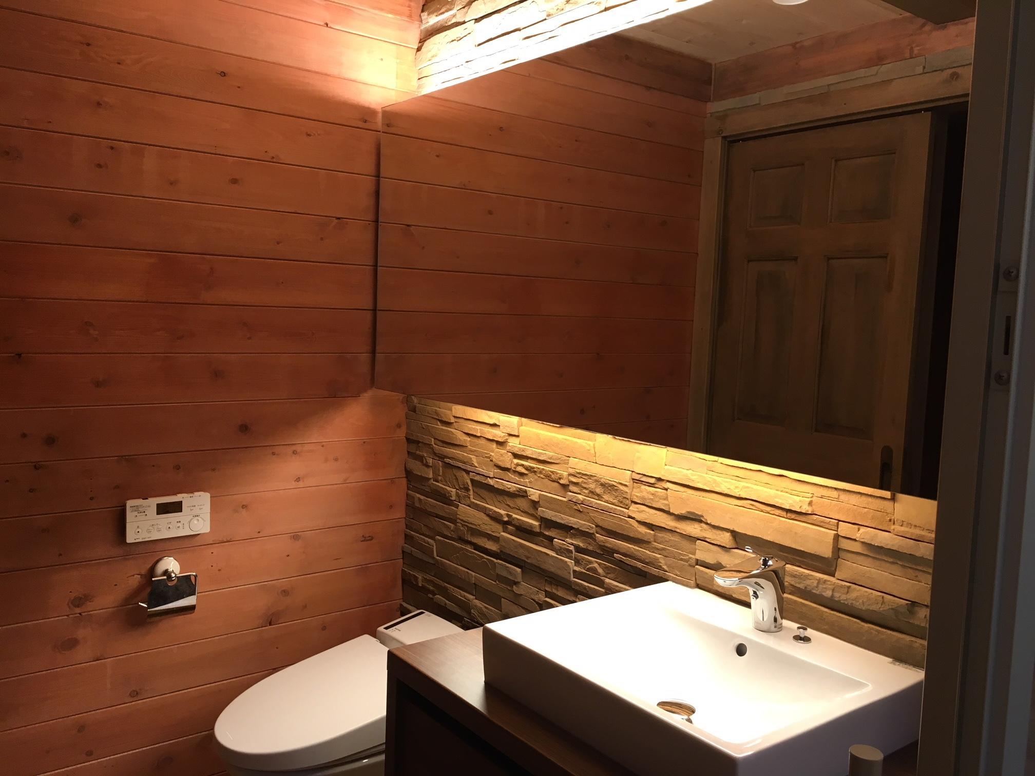 間接照明をご希望されており、今回の仕上がりとなりました! 背面には岩肌調のタイルを貼り、照明器具は調光調色タイプと することで、気分に合わせて様々な表情を魅せてくれる洗面空間に なったのではないかと、思います♪