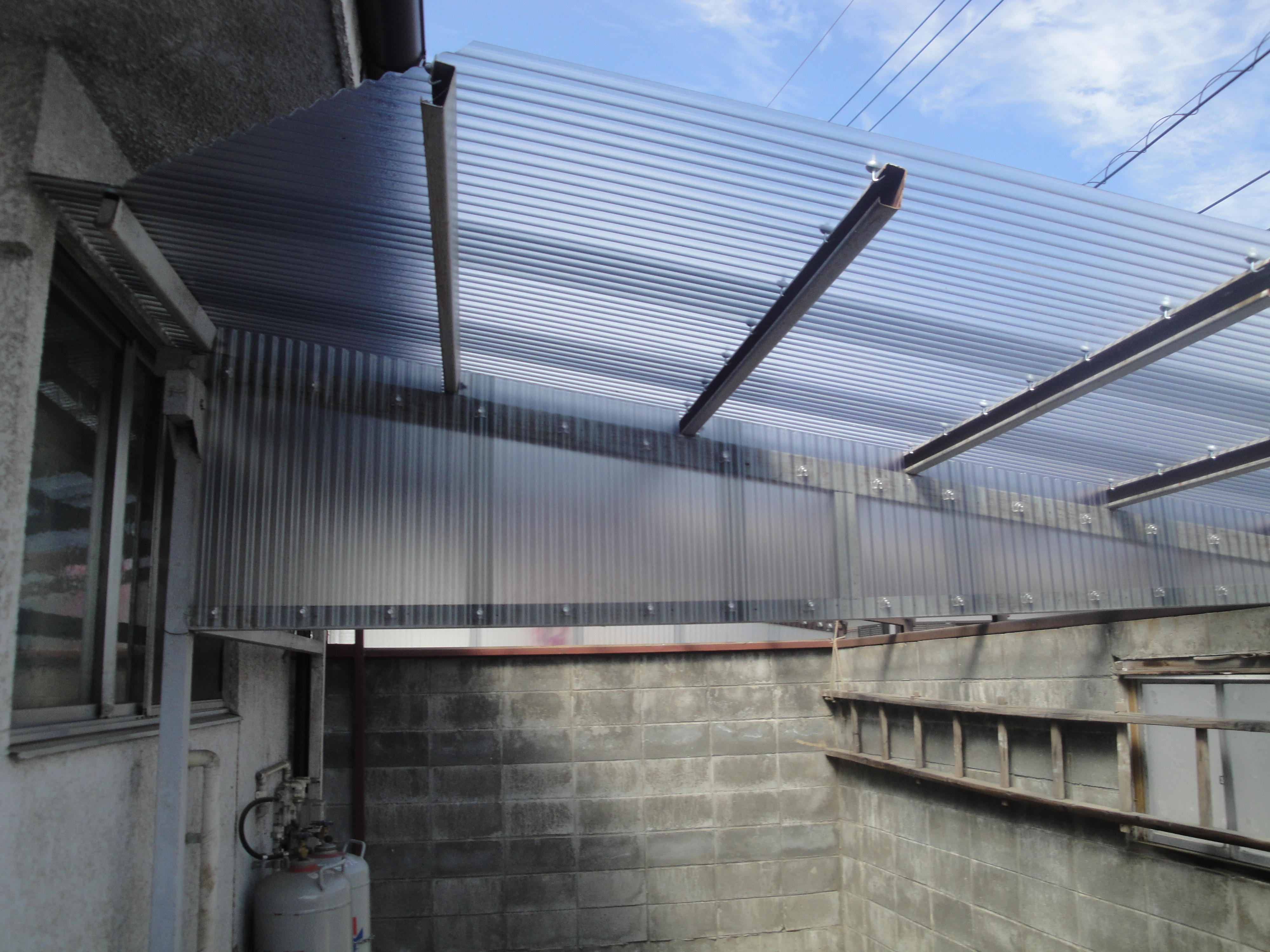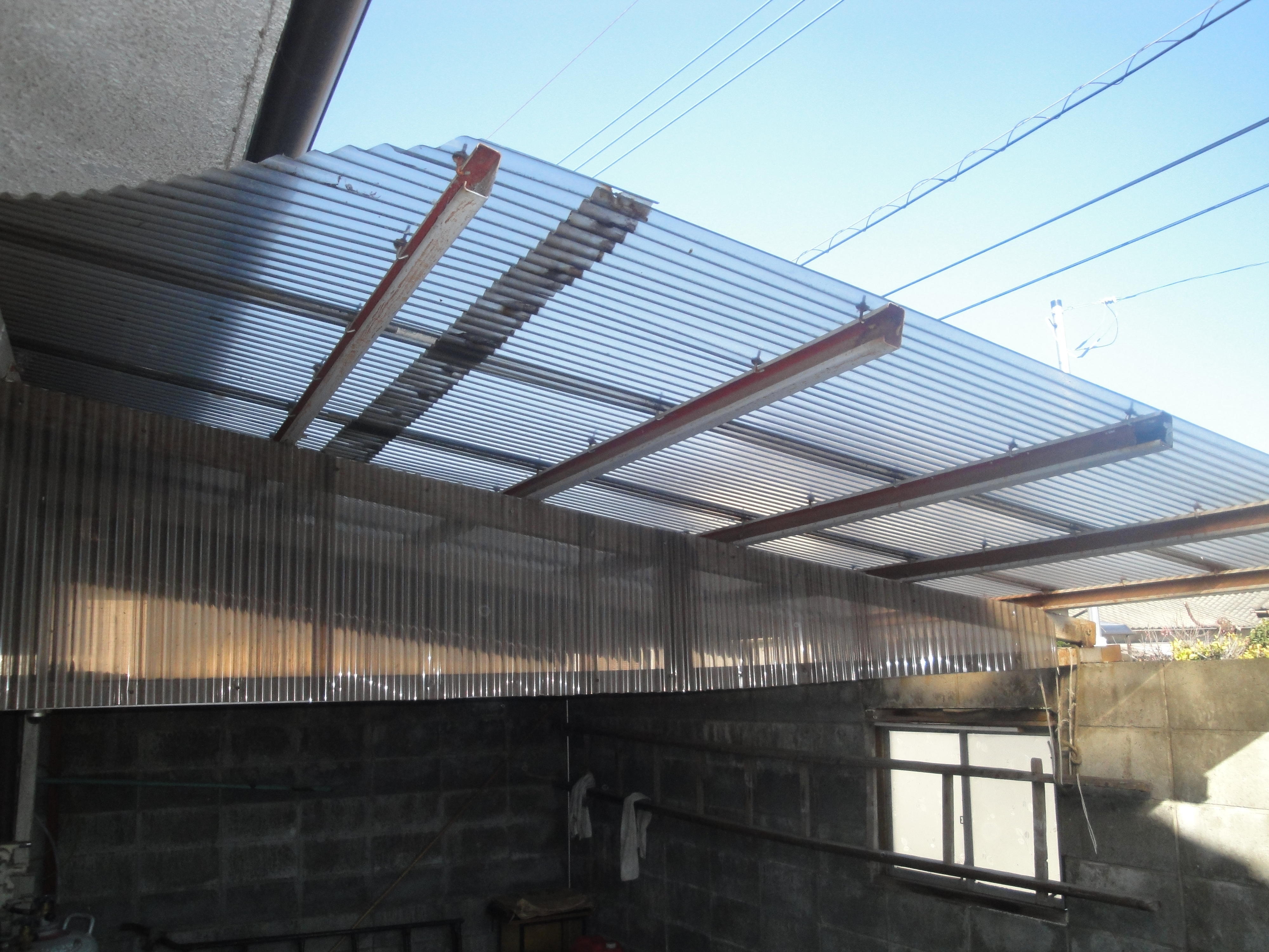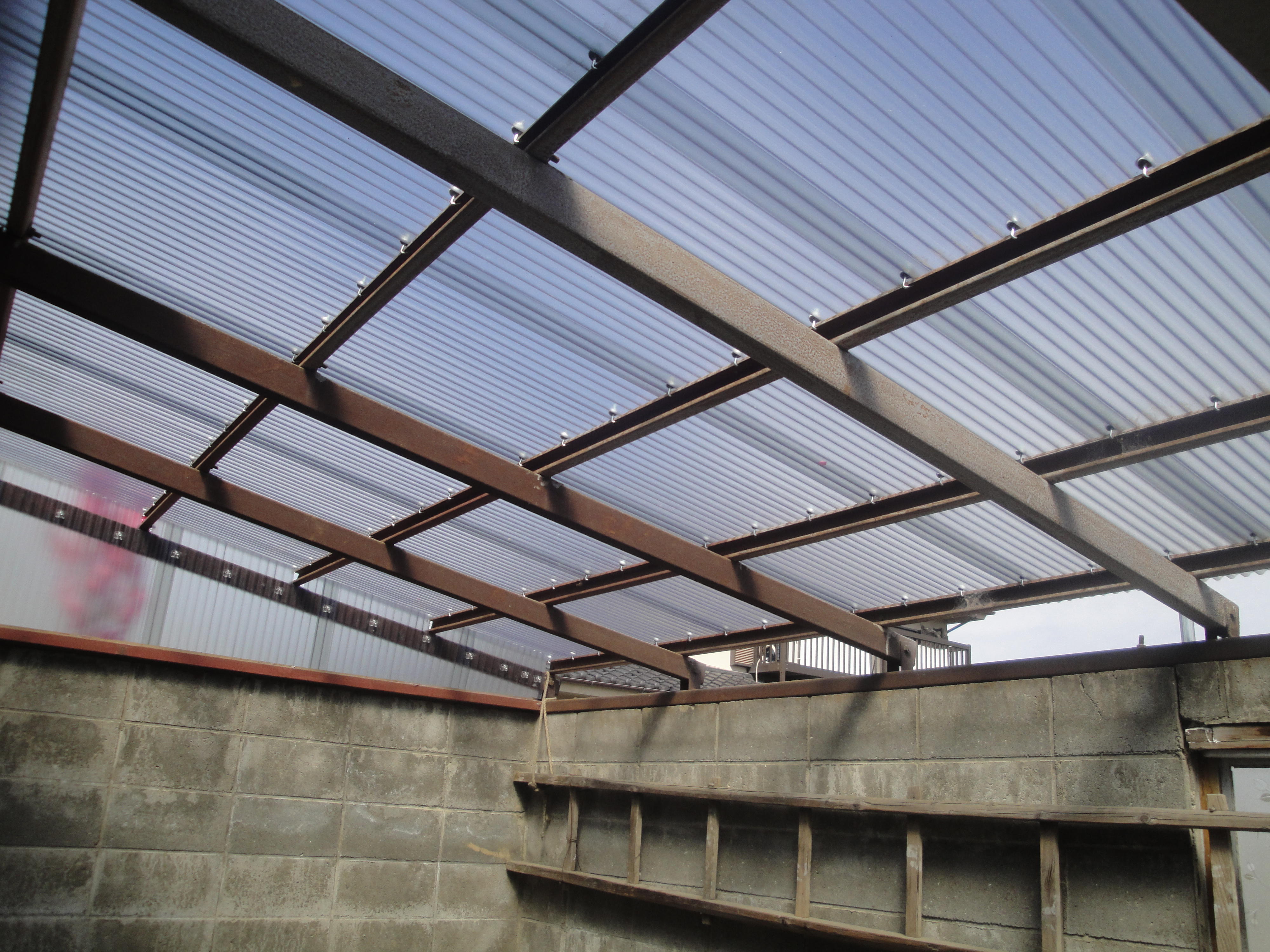 鉄骨車庫の屋根材が経年劣化で傷み、留め具も所々吹き飛んで欠損していました。 屋根をすべて撤去し、【タキロン製 ポリカ/熱線カットタイプ】に交換しました。以前と比べて車庫内の真夏の日差しが大幅に軽減できますのでオススメです。