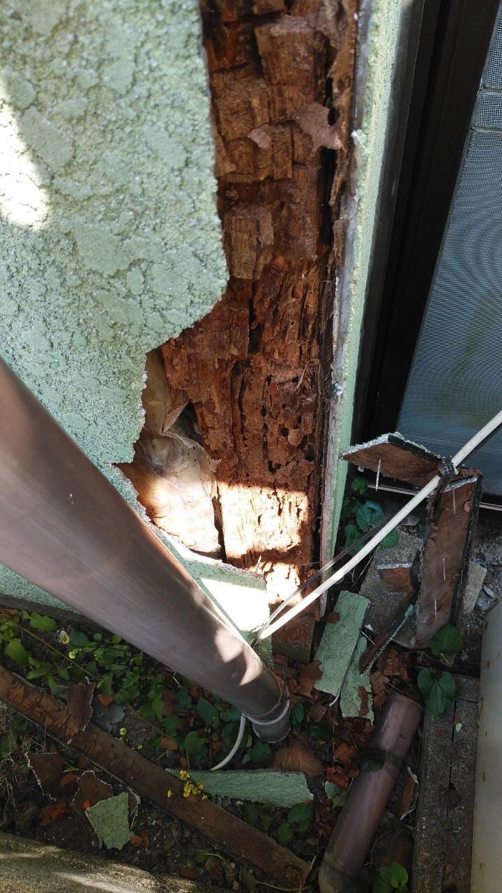 戸建て住宅の建物を支える柱が腐食し、交換作業中です(+_+) 事の発端は、雨樋の交換作業中に竪樋を固定する金具を外壁に打ち込んでいると、妙に軽い・・・ 恐る恐る外壁を叩いてみると外壁材でかろうじて外観は保てていたが、中の柱がスポンジケーキの様にスカスカ/フワフワ状態でした(T_T) 防水機能が低下し、内部にダメージを与えていました。 至急お施主様に確認していただき、只今柱取り替え工事中です! 目視では気づきにくい箇所程、どうしても発見が遅くなります。皆さまも大事な住まいを長持ちさせる為に、外壁・屋根・床下の点検をお薦め致します!
