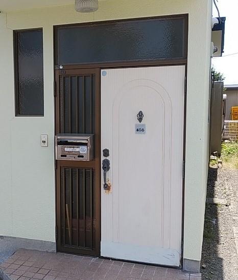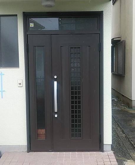 玄関ドアの老朽化に伴い、リフォーム玄関ドアの「リシェント3」に入れ替え。玄関内の明るさを保つため、ランマのデザインはそのままに重厚感のある玄関になりました。