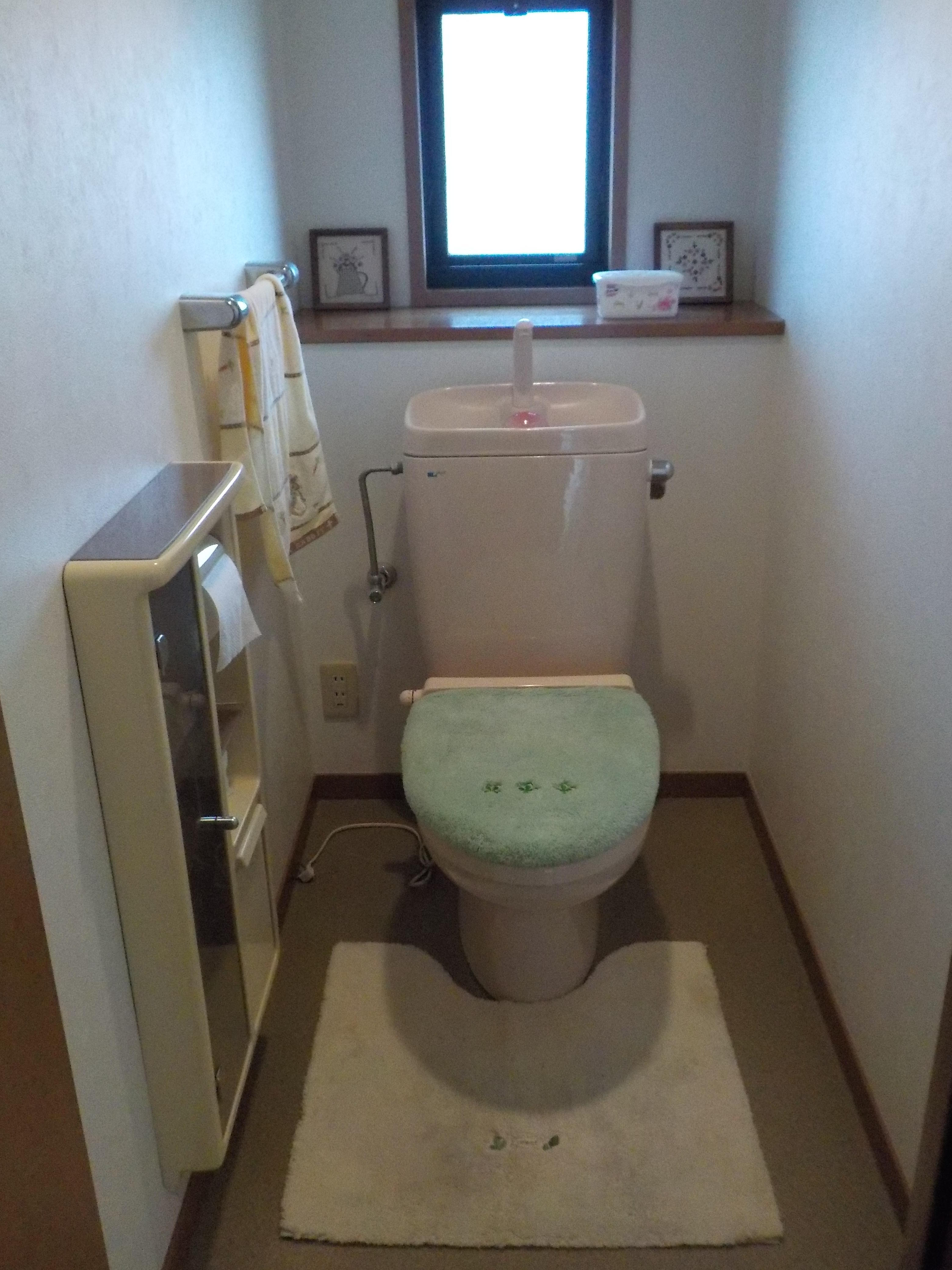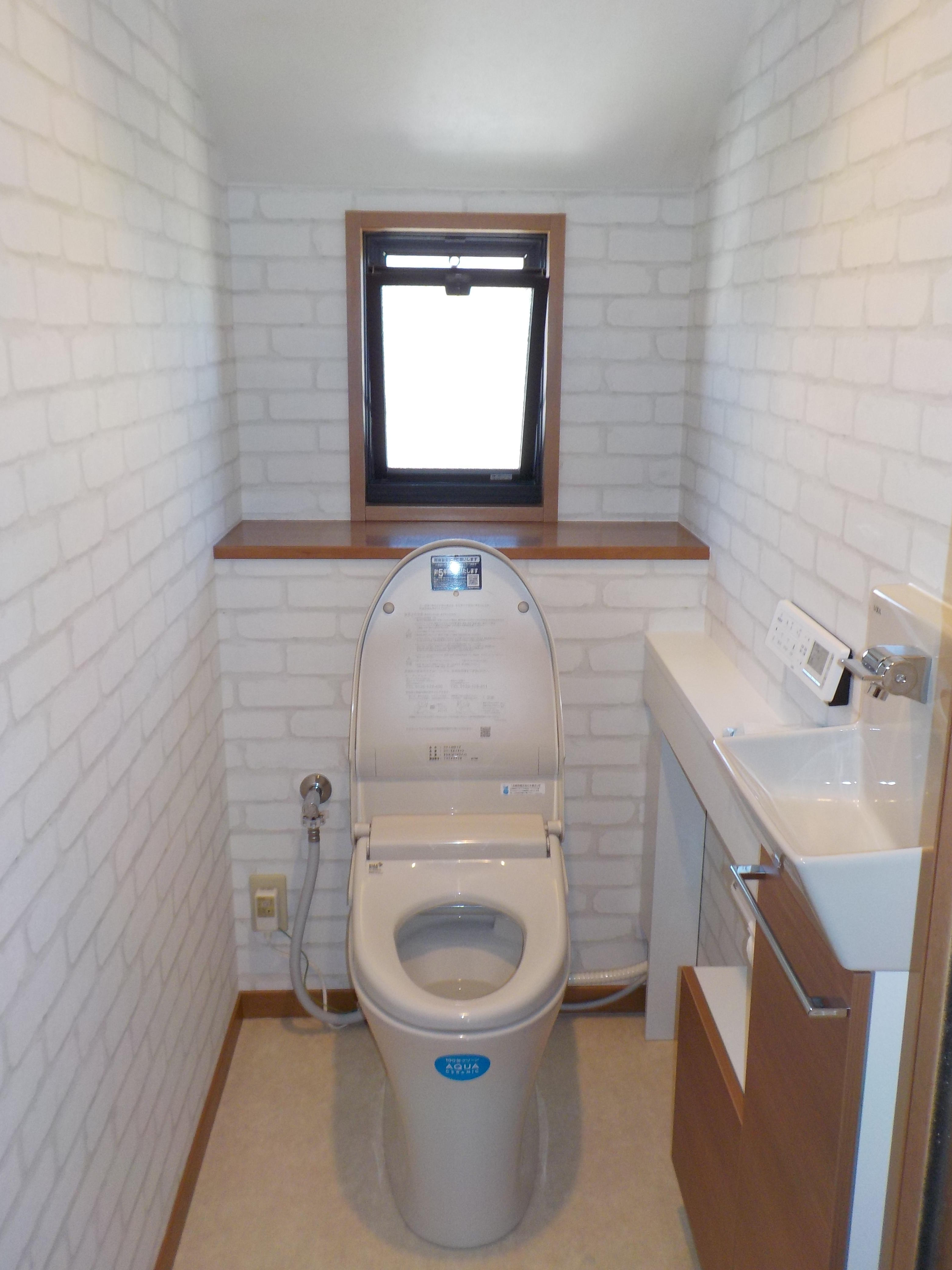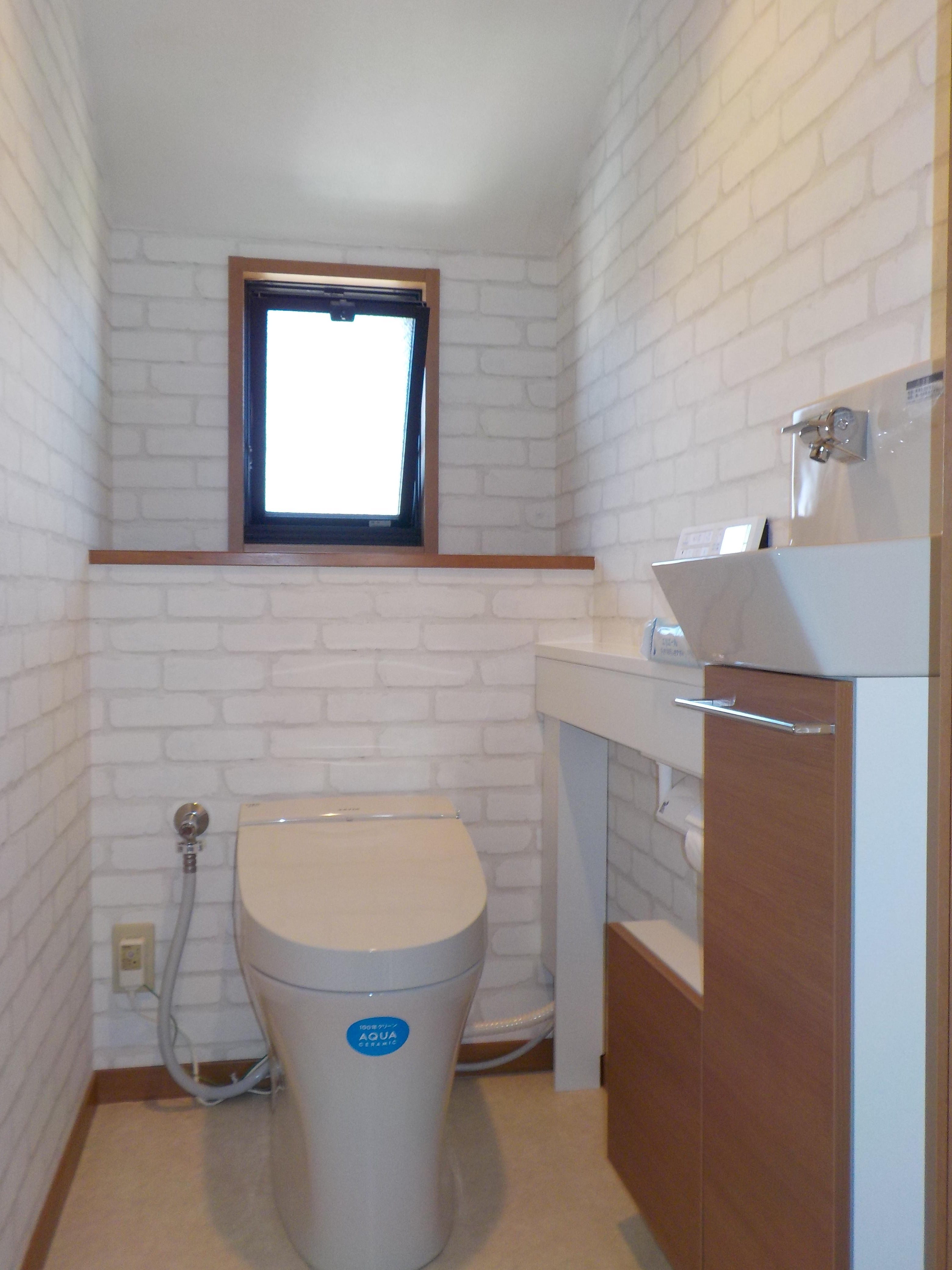 今回トイレを一新されたいとの事でクロスや床も張替ました。タンクレストイレに分岐給水して手洗い器を取付ました(/・ω・)/ 扉は建具に合わせナチュラル色でレンガ調のクロスと調和され、お洒落なトイレルームに生まれ変わりました☆彡