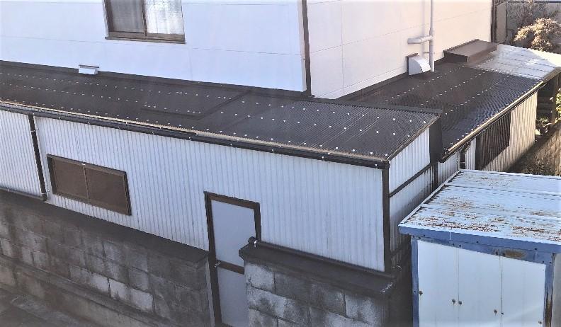 母屋の屋根からの物置の屋根に落ちて、破損してしまう為、物置の屋根材を強度の高い屋根材に張り替えました。