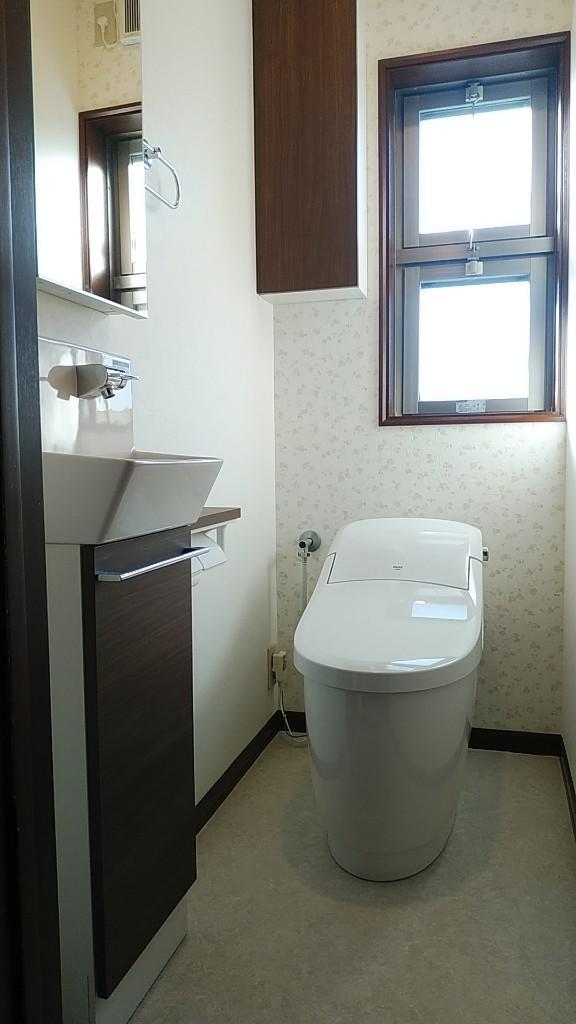 手洗い器の故障に伴い、年数も経っているので、トイレの内装も含めたリフォームをしました。 便器はプレアスLS、手洗い器(コフレル)を設置。以前のピンクの色合いから、木彫のデザインで落ち着いた雰囲気になりました。