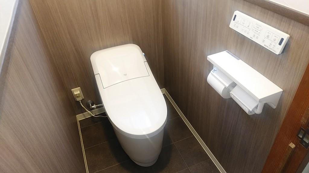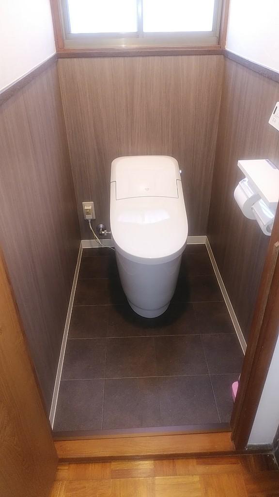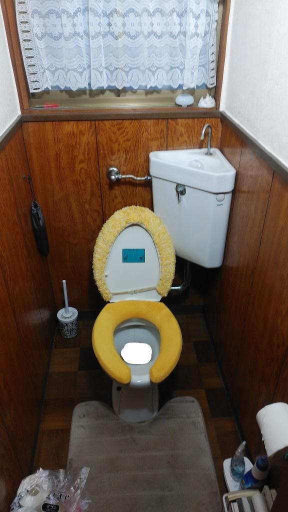 昔ながらの洋便器をスッキリとしたタンクレストイレにリフォーム。床が劣化したガタツキがあったので、床を直してから便器を交換しました。内装は奥様の好みのシックな木彫にして、落ち着いた高級感のあるトイレルームに仕上がりました。