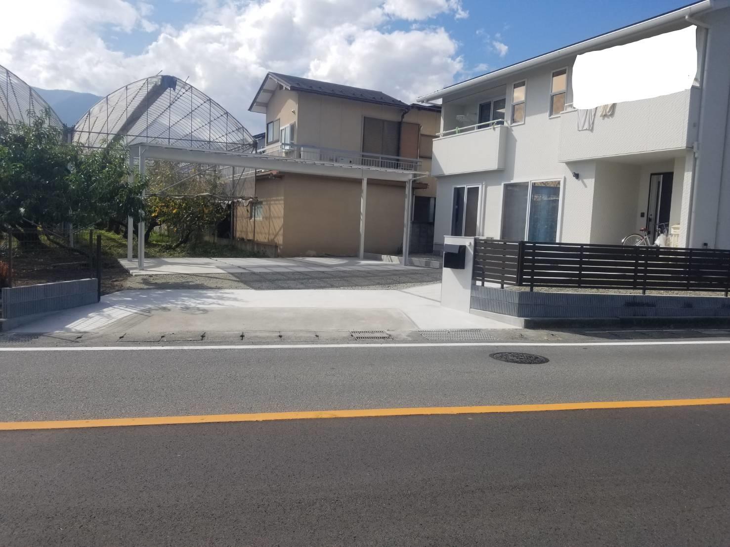 砂利敷きのお客様宅にフェンスとカーポートを設置。大通り沿いの為、プライバシーの確保と飛び石などの防止になりました。