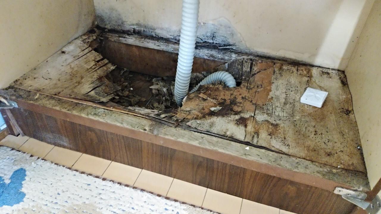 洗面室のリフォーム工事です。 漏水で洗面台の底板が腐食し抜け落ちてしまいました。 洗面台交換・洗濯機防水パン取付け・内装貼り替えを施し明るい空間に生まれ変わりました。 お施主様には工事中たくさんお気遣い頂きました(T_T)
