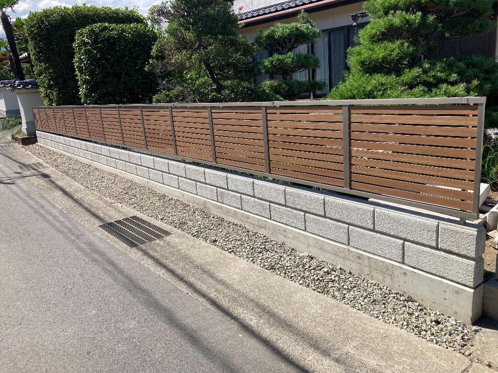 経年劣化してきたブロック塀を、流行りの目隠しフェンスに建て替えました。 今まで距離が長く高いブロック塀だったので、安全性に配慮。 道路側への倒壊を防ぐする為、ベースのブロックは低く設置しました。