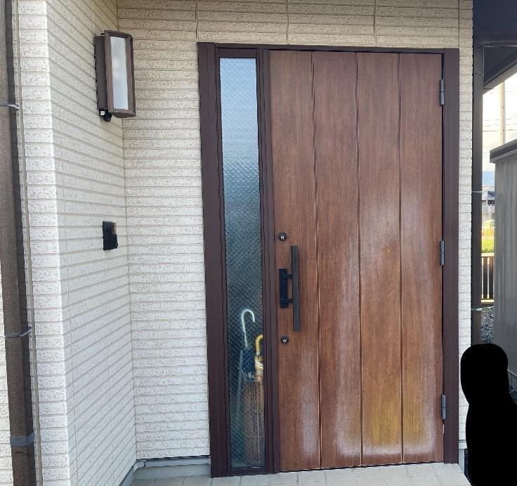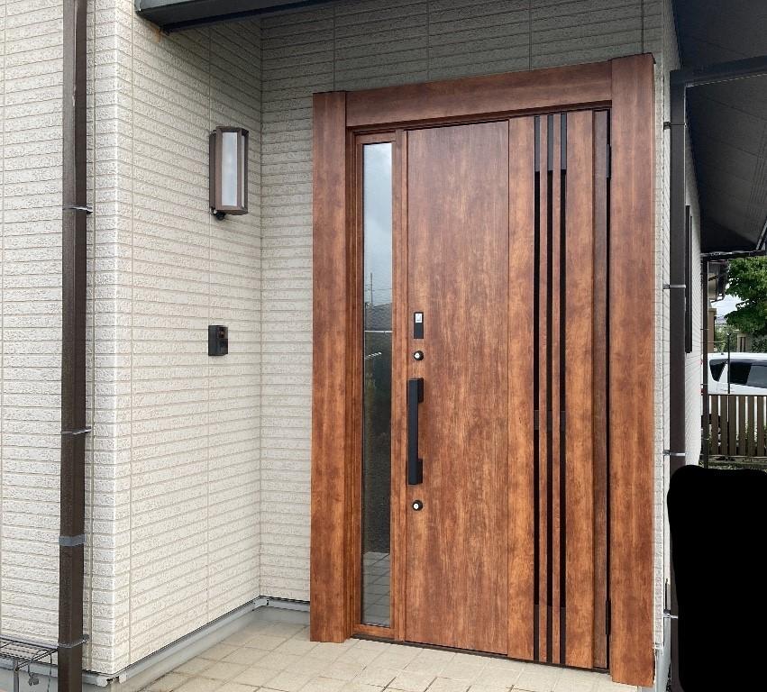 経年で色褪せた玄関ドアをリフォーム用玄関ドア「リシェントⅢ」に入れ替えました。人気の木彫タイプのデザインで、さらに採風タイプを搭載。簡単タッチレスキーで快適な玄関ドアになりました。
