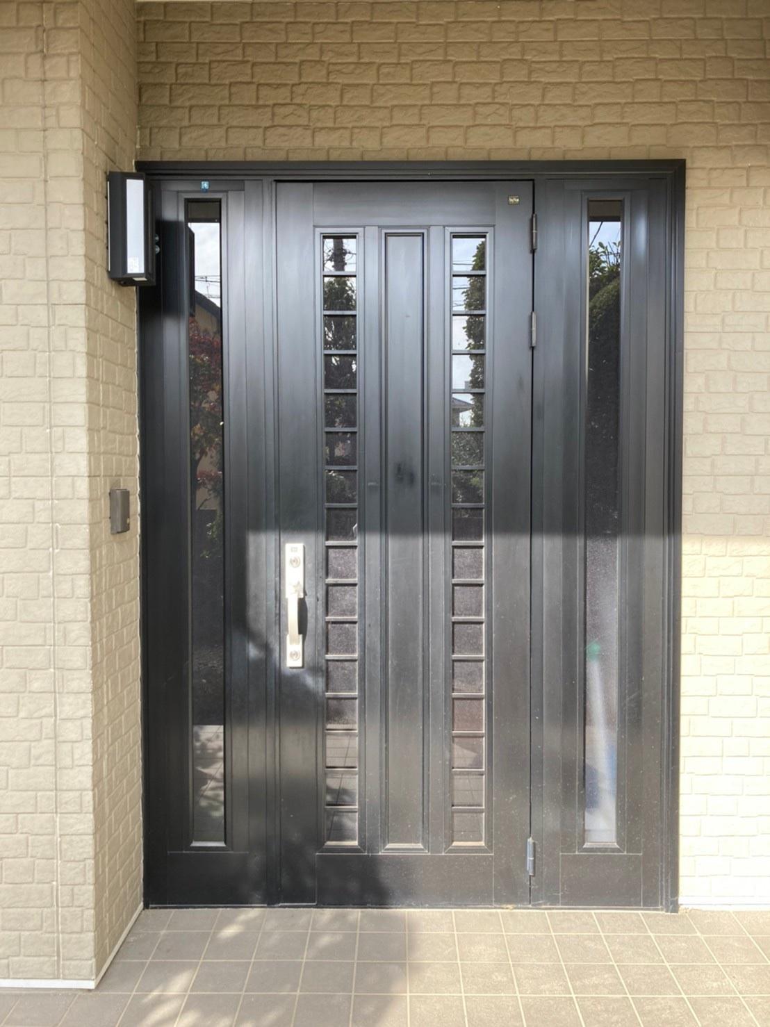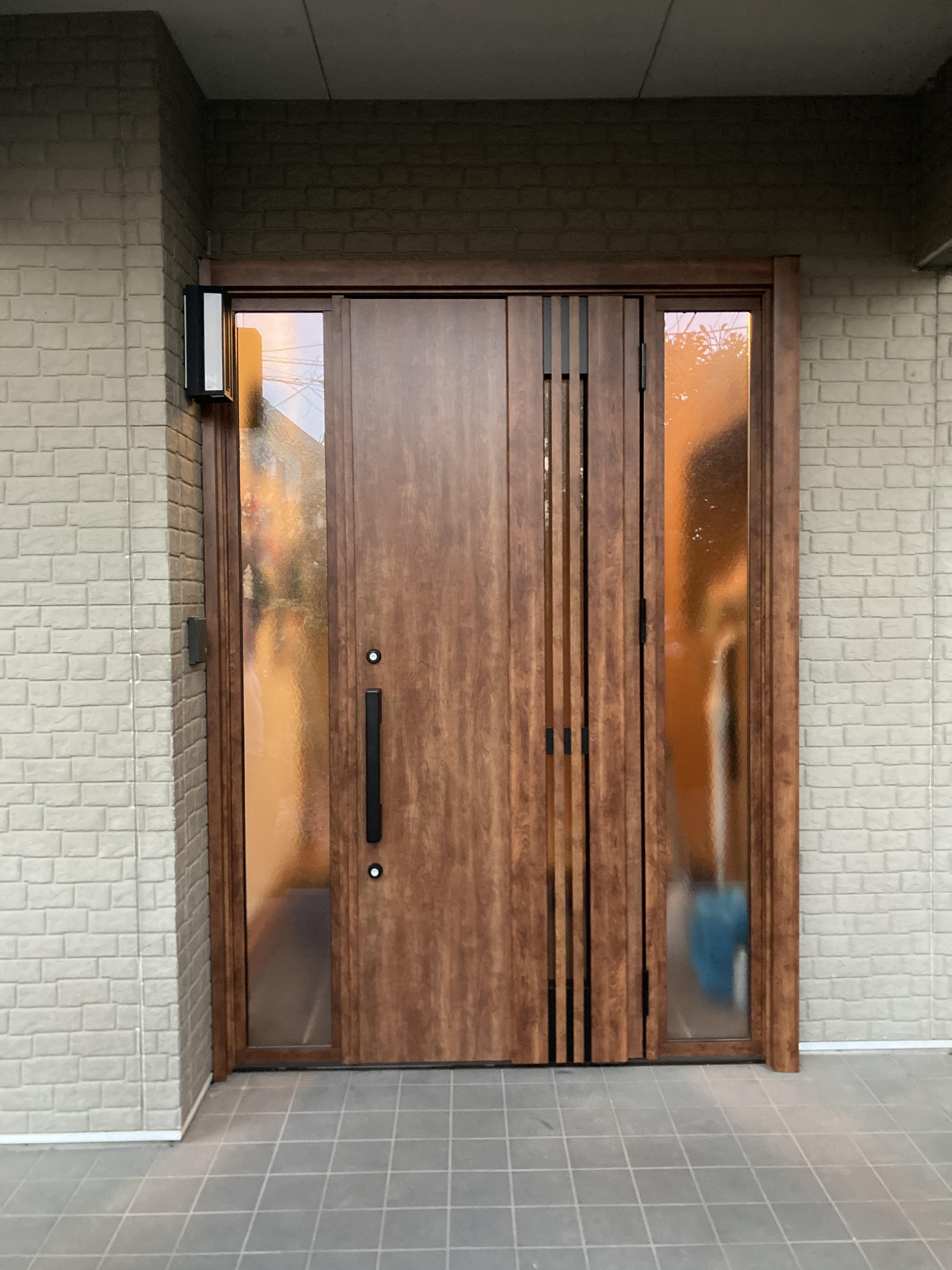 鍵の不具合が頻繁に起きていた為、玄関ドアを全て交換しました。 LIXIL製玄関ドア リシェント3 断熱タイプです。両袖ガラスの面積が広くなり玄関が明るくなりました(^_^) 採風仕様の玄関ですのでドアを施錠したまま風が取り入れ可能な優れものです(^O^) ブラックから木目調の茶色にリニューアルし、玄関が生まれ変わりましたね☆