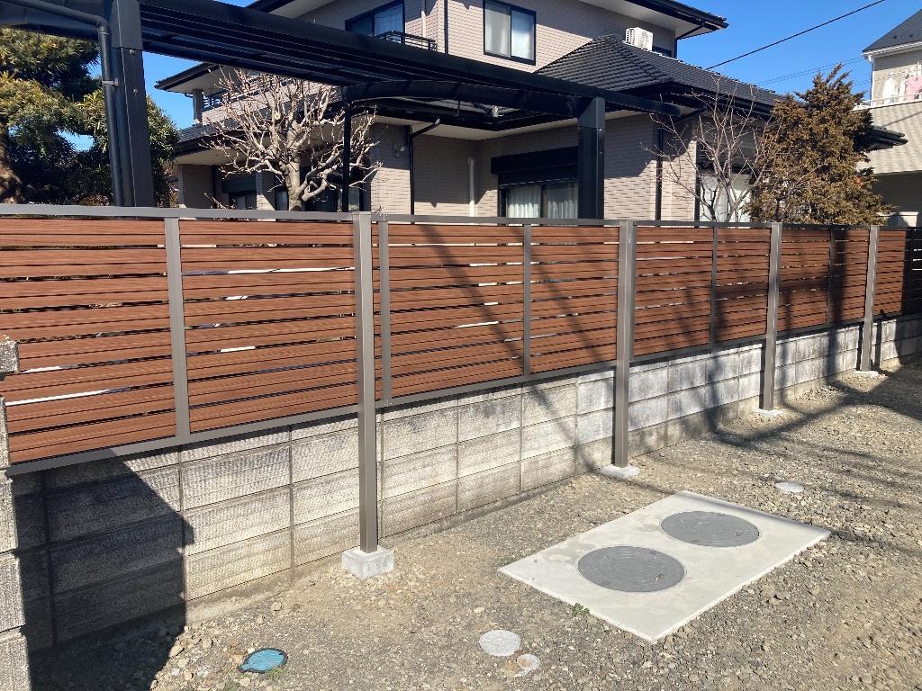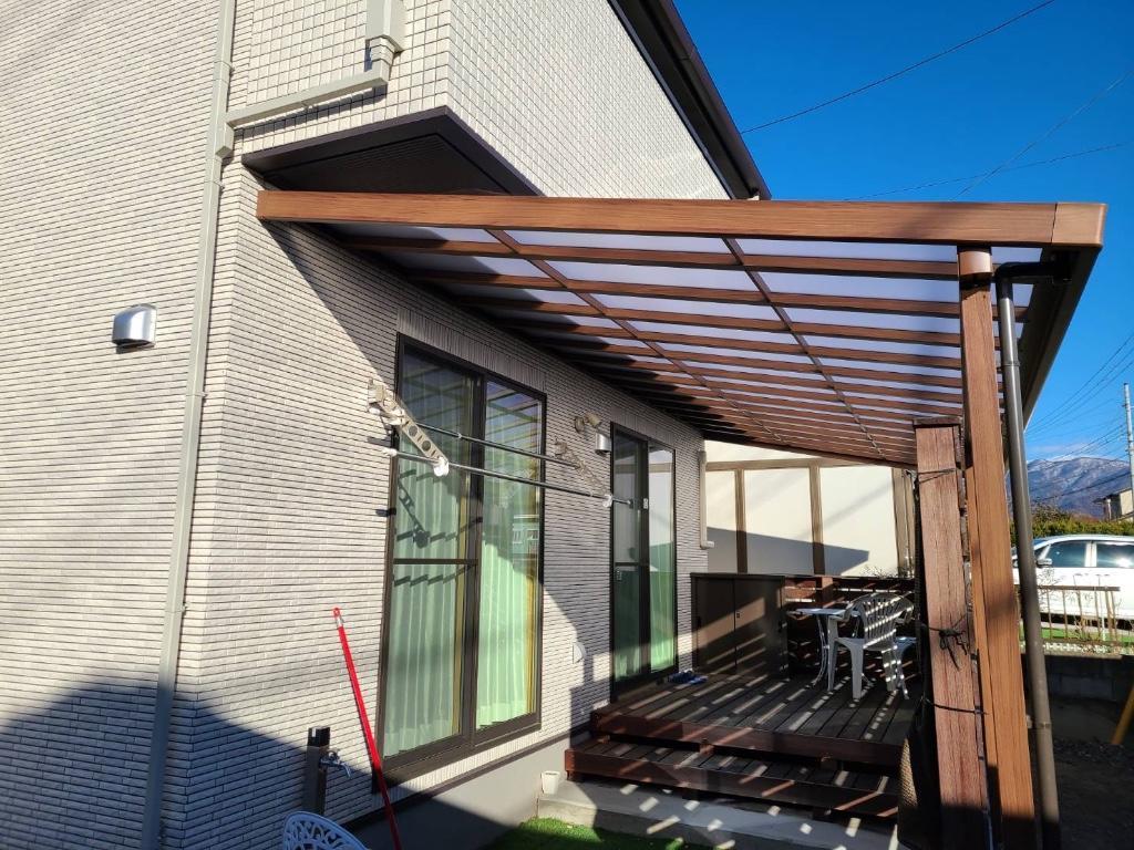 日差しの強いデッキと人工芝の空間でお子様と快適に遊べるようにテラス屋根を設置。さらに窓にはシェードを設置して、西日の防止を。来客の際に目隠しになるように、目隠しフェンスとポールも設置しました。お客様のご要望でデザインを木彫に統一し、シックなお住まいにアクセントのブラウンが際立ちます。