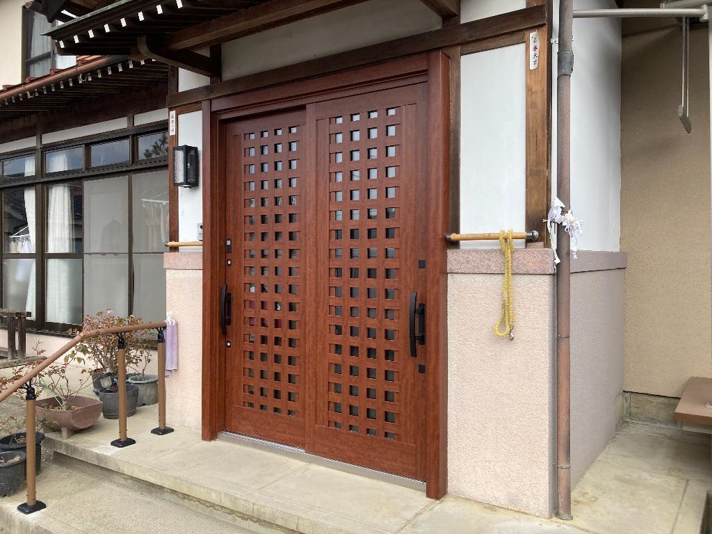 経年で劣化しはじめてきた玄関引戸を入れ替え。防犯性の向上も考え、LIXILリフォーム玄関引戸「リシェント」を設置しました。デザインはアルミから木彫タイプに一新して、玄関のイメージも変わりました。