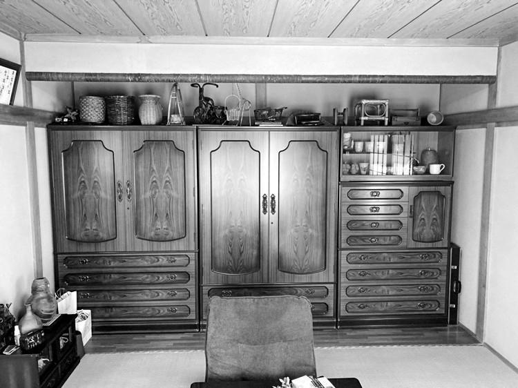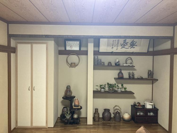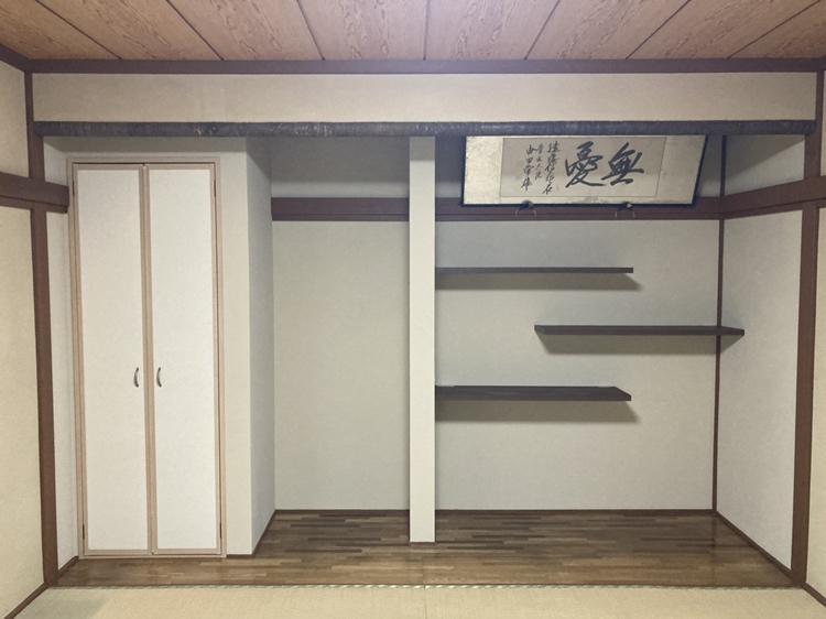 長年顎愛用されたタンスを処分し、奥様の趣味である陶芸品を飾る棚と、ご来客時の座布団を収納できるクローゼットを作成致しました。
