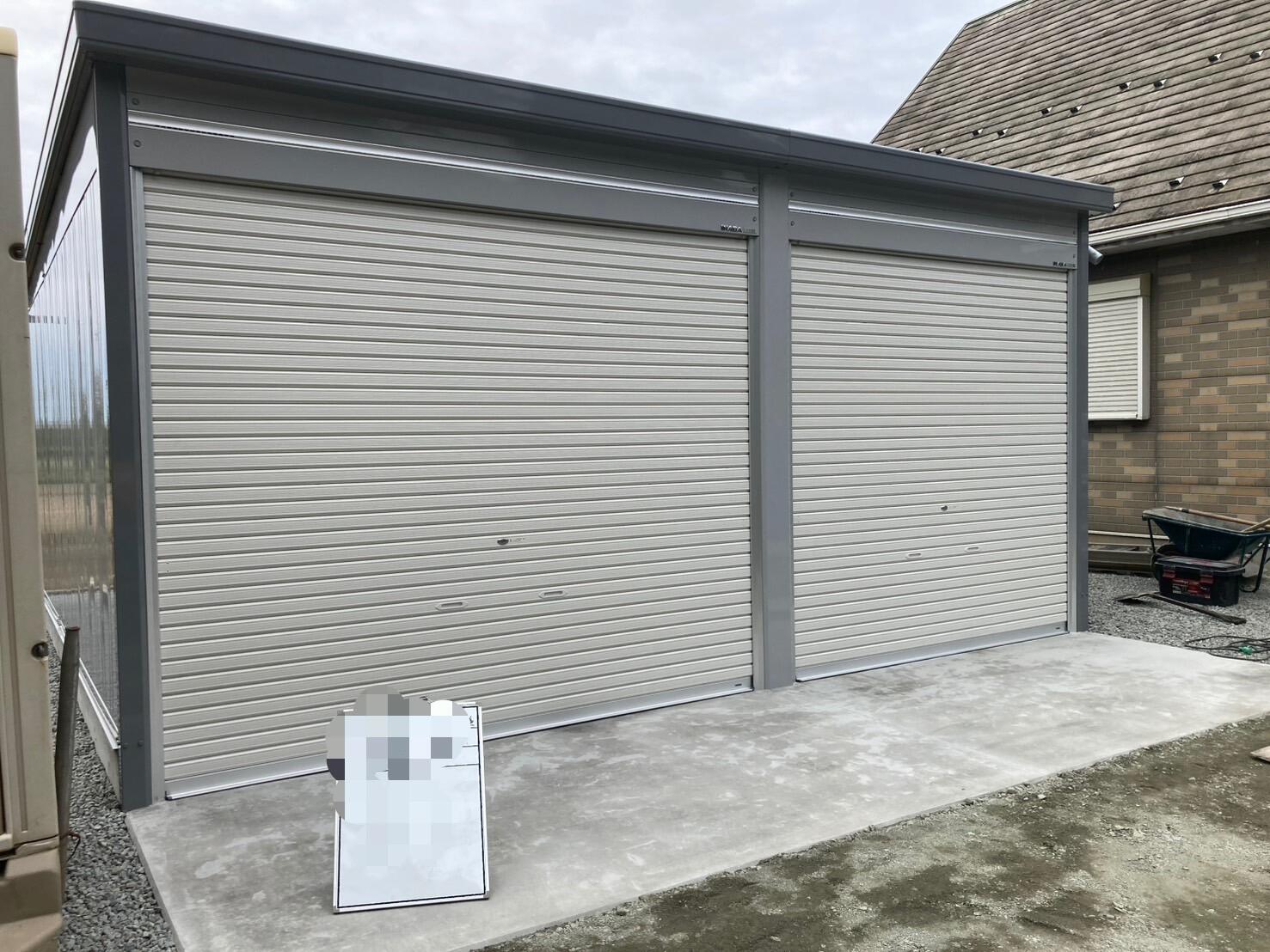 イナバ製2台用ガレージ/ガレーディアを新築しました。 シャッターとは別に出入口ドアを設けて使いやすさUPです。 ガレージの周りには防草シートを敷き、その上に砕石を撒いて夏の雑草対策にも配慮しました。