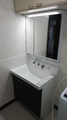 【洗面台リフォーム】(甲府市) 洗面化粧台をLIXILピアラに交換して、シックな落ち着いたイメージに。壁付け可動棚も取付けました。