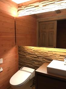 【トイレリフォーム】(富士河口湖町) トイレリフォームでLIXILの岩肌調のタイルを壁に貼り、トイレはLIXILサティスを搭載して周りをスッキリと