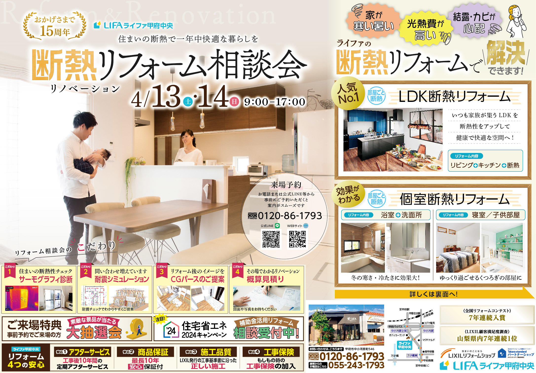 ライファ甲府中央では、断熱リフォームで快適な暮らしをテーマに「断熱リフォーム相談会」を開催します。