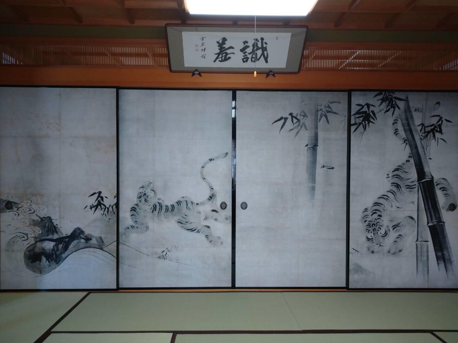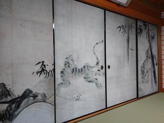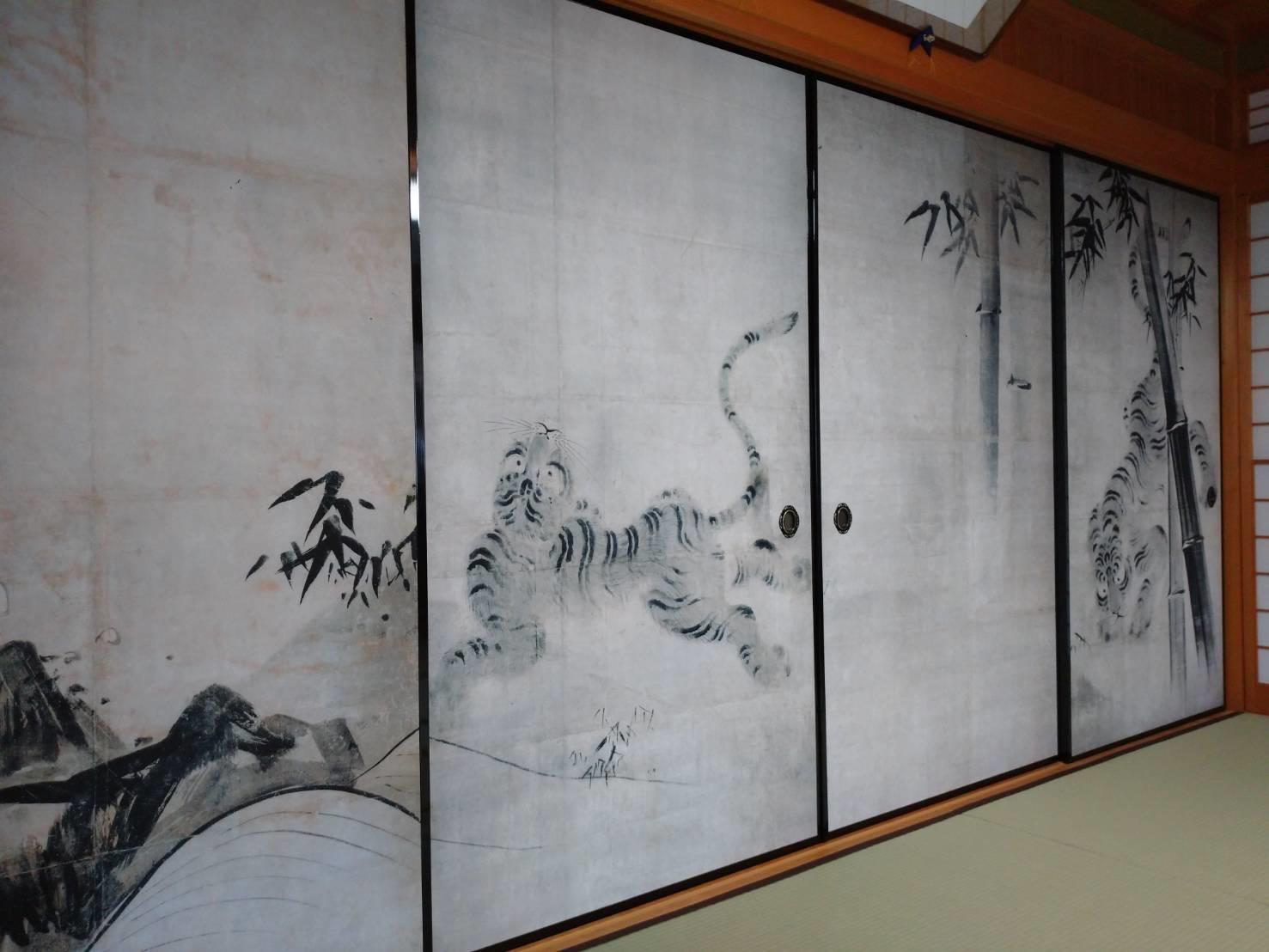 多治見市根本町にある、元昌寺さんの襖の張替えをしました。 こちらの虎の襖は、京都妙心寺の敷地内にある大方丈という重要文化財の建物内にある襖の書画のレプリカになります。 書画の作者は狩野益信という有名な方です。 大方丈は基本一般公開されていないそうなので、一度元昌寺さんを訪れてみてはいかがでしょうか。