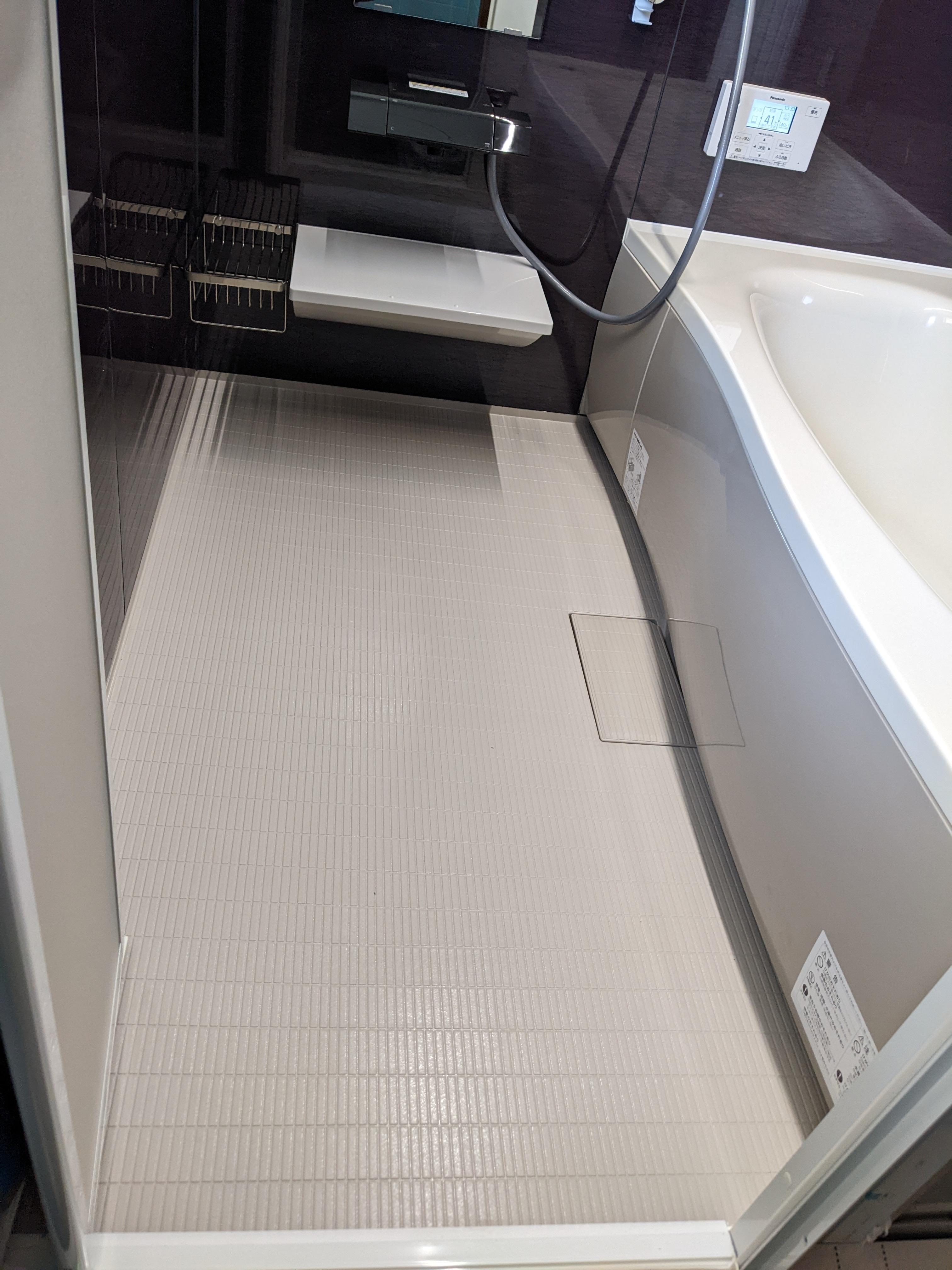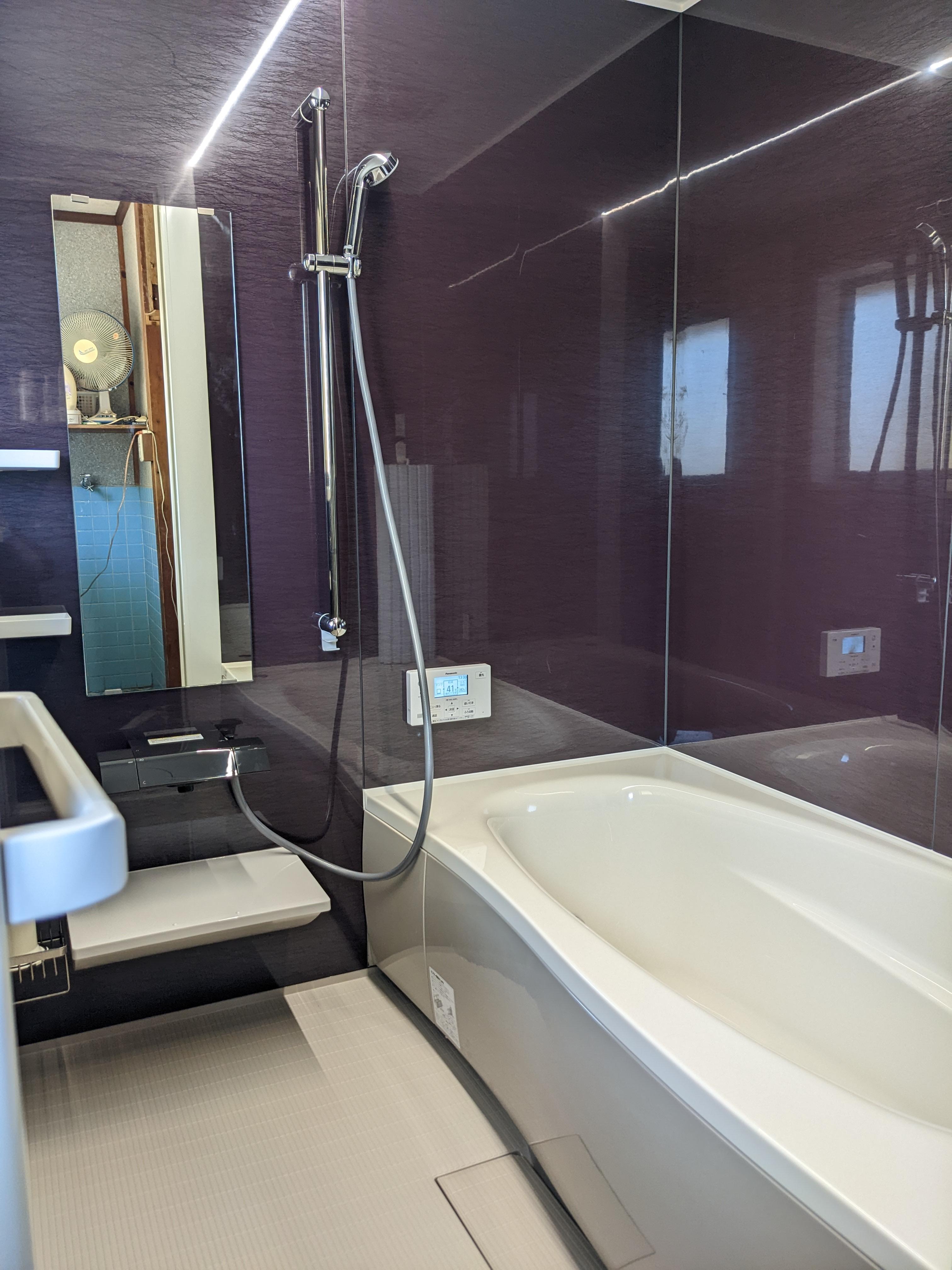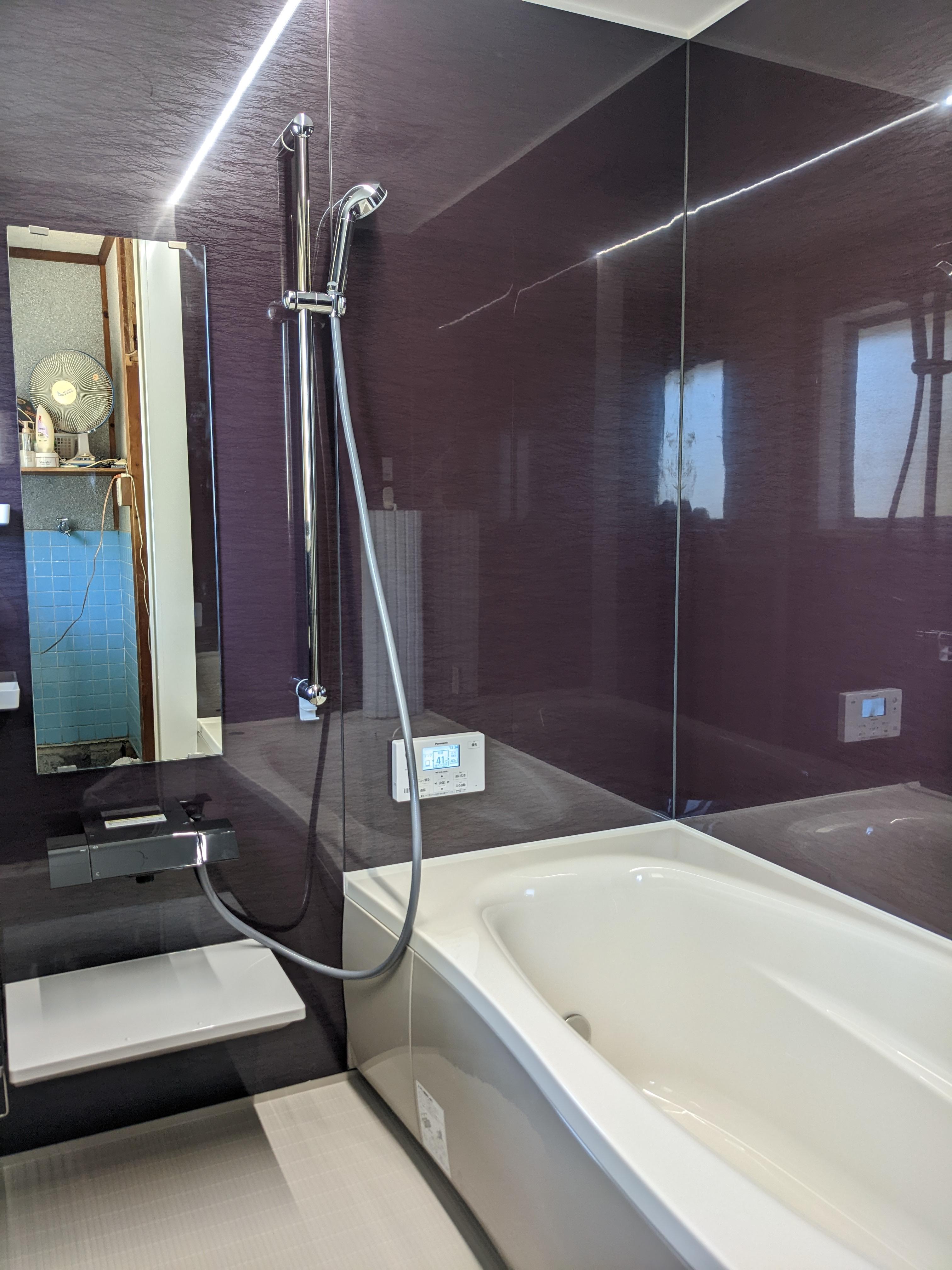 在来工法のタイル壁の浴室をユニットバスへ取替工事をしました。 既設の浴室の広さより、広いユニットバスにしました。 お風呂を大きくしたので、壁を一部取り壊し新たに壁をおこして 違和感がないクロスで仕上げました。 脱衣室の扉も取替して、床の貼替、壁も一部貼替をしました。