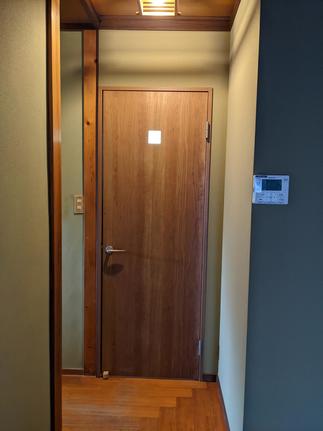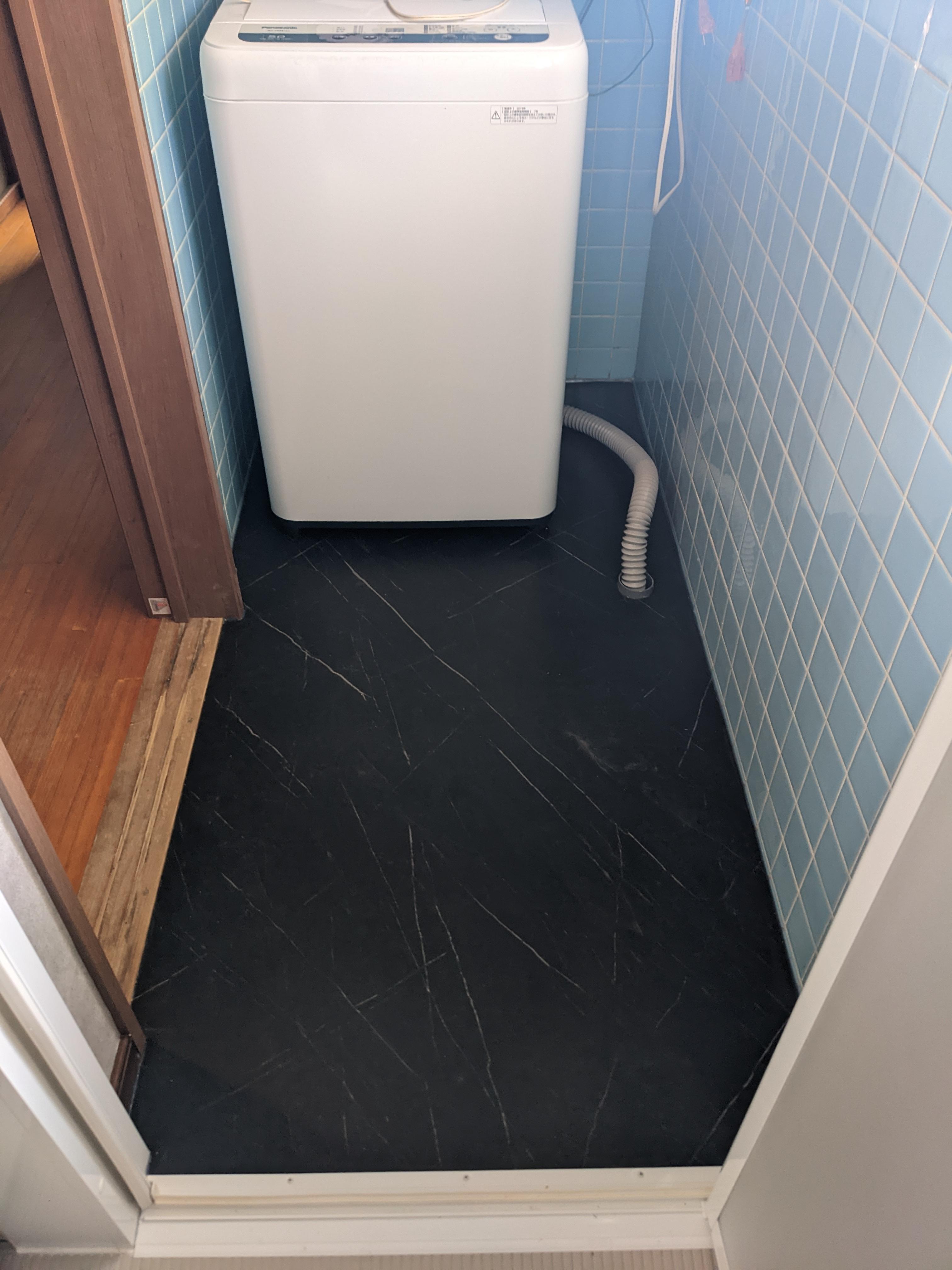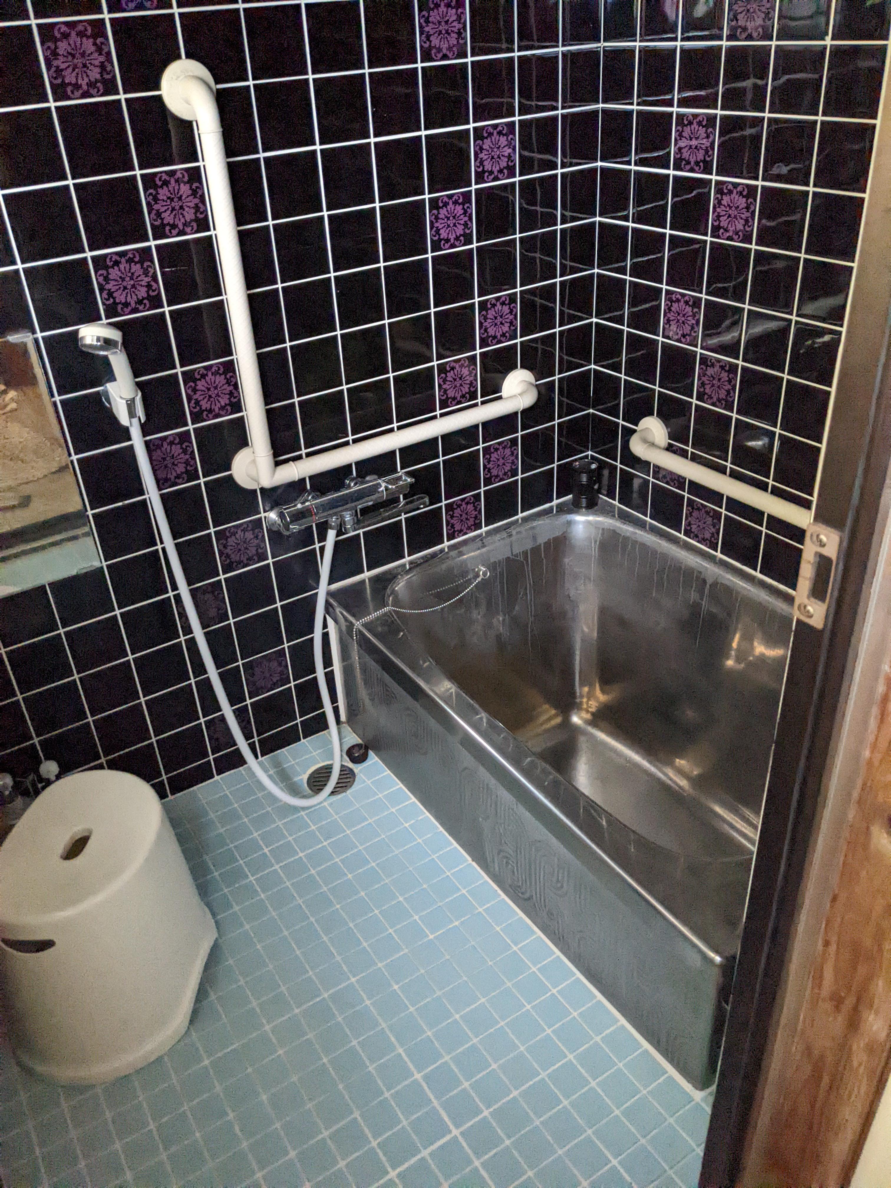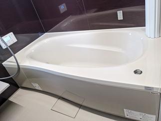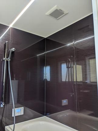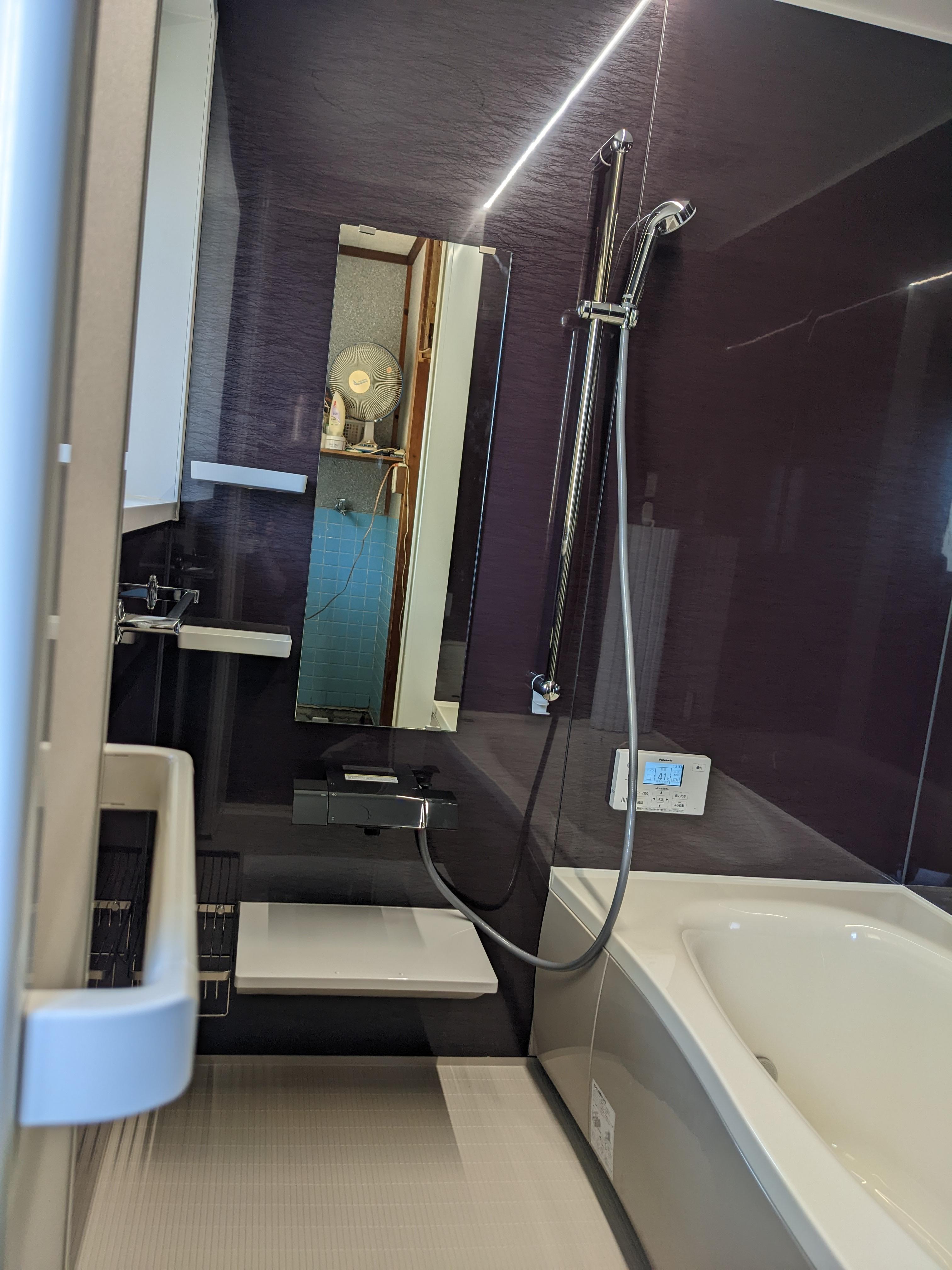 在来工法のタイル壁の浴室をユニットバスへ取替工事をしました。 既設の浴室の広さより、広いユニットバスにしました。 お風呂を大きくしたので、壁を一部取り壊し新たに壁をおこして 違和感がないクロスで仕上げました。 脱衣室の扉も取替して、床の貼替、壁も一部貼替をしました。